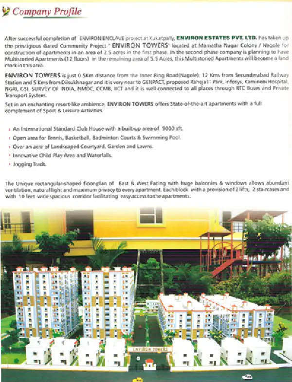 Gated Community Project ENVIRON TOWERS located at Mamatha Nagar Colony / Nagole for construction of apartments in an area of 2.5 acres in the first phase. In the second phase company is planning to have Multistoried Apartments (12 floors) in the rema...