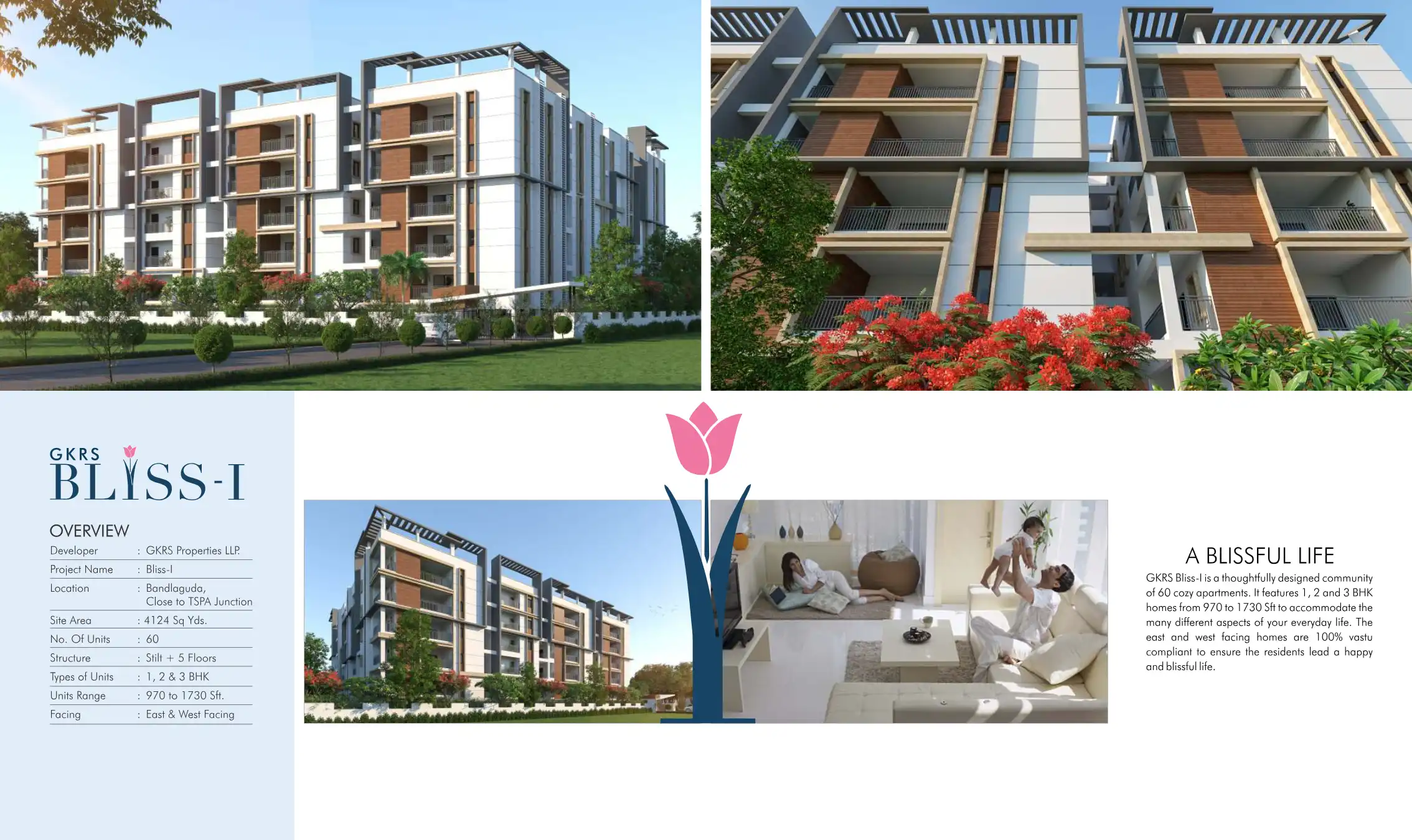 GKRS Bliss-I is a thoughtfully designed community of 60 cozy apartments. It features 1, 2 and 3 BHK homes from 970 to 1730 Sft to accommodate the many different aspects of your everyday life. The east and west facing homes are 100% vastu compliant to...