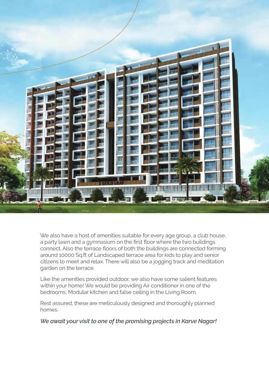 1 & 2 BHK Homes in Karve Nagar, Pune. Project offers amenities like a club house, a party lawn and a gymnasium. It has air conditioner in one of the bedrooms, Modular kitchen and false ceiling in the Living Room.