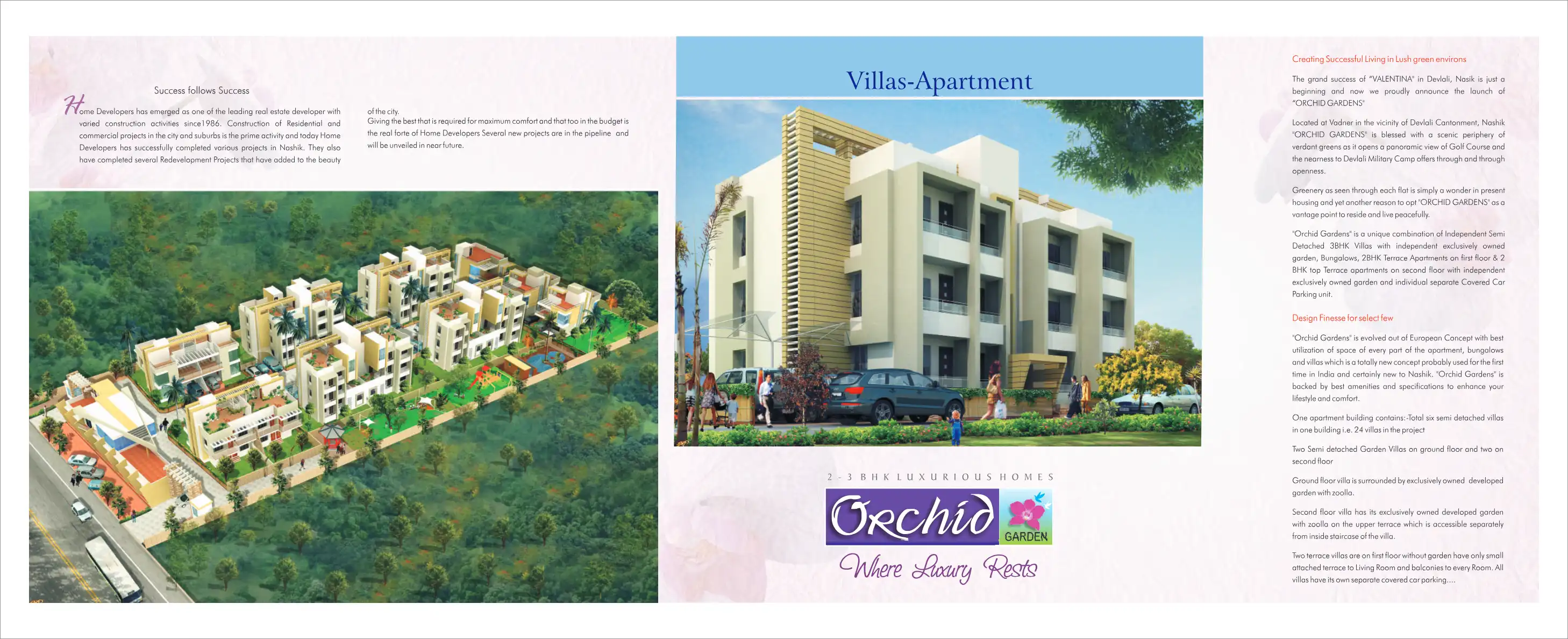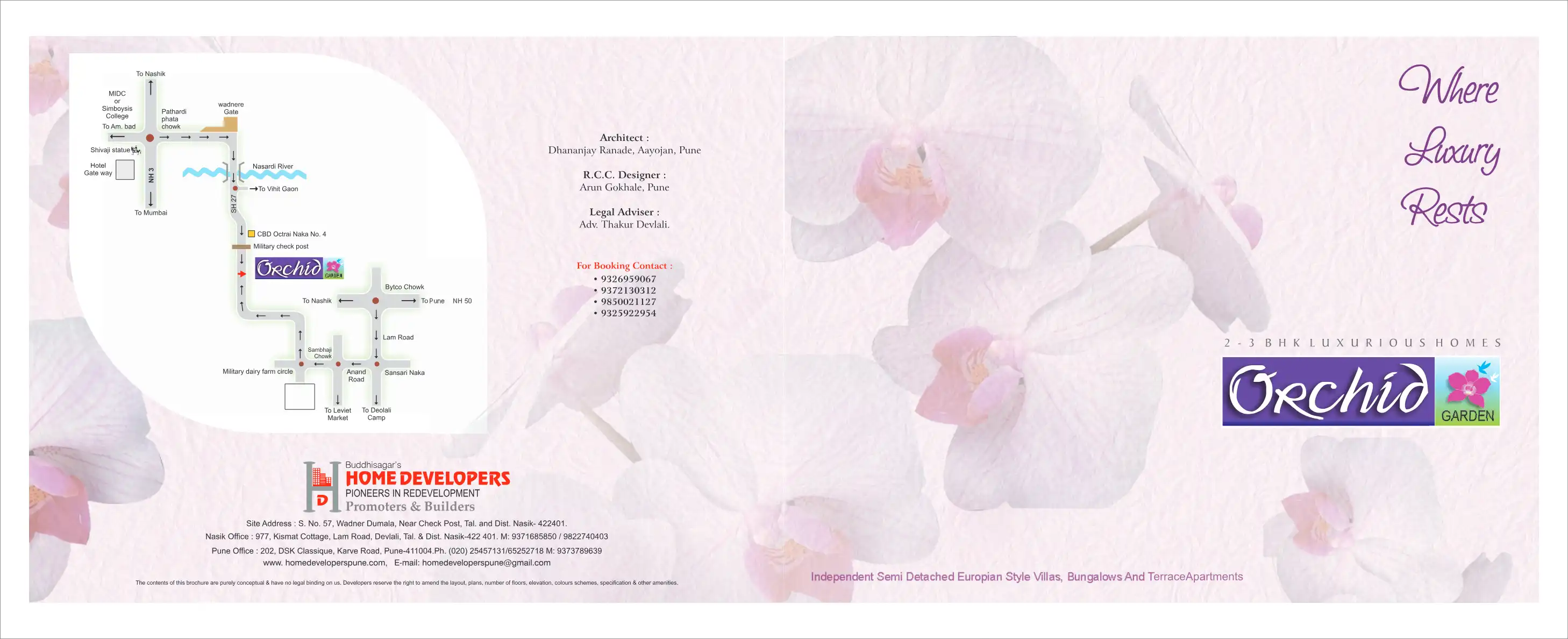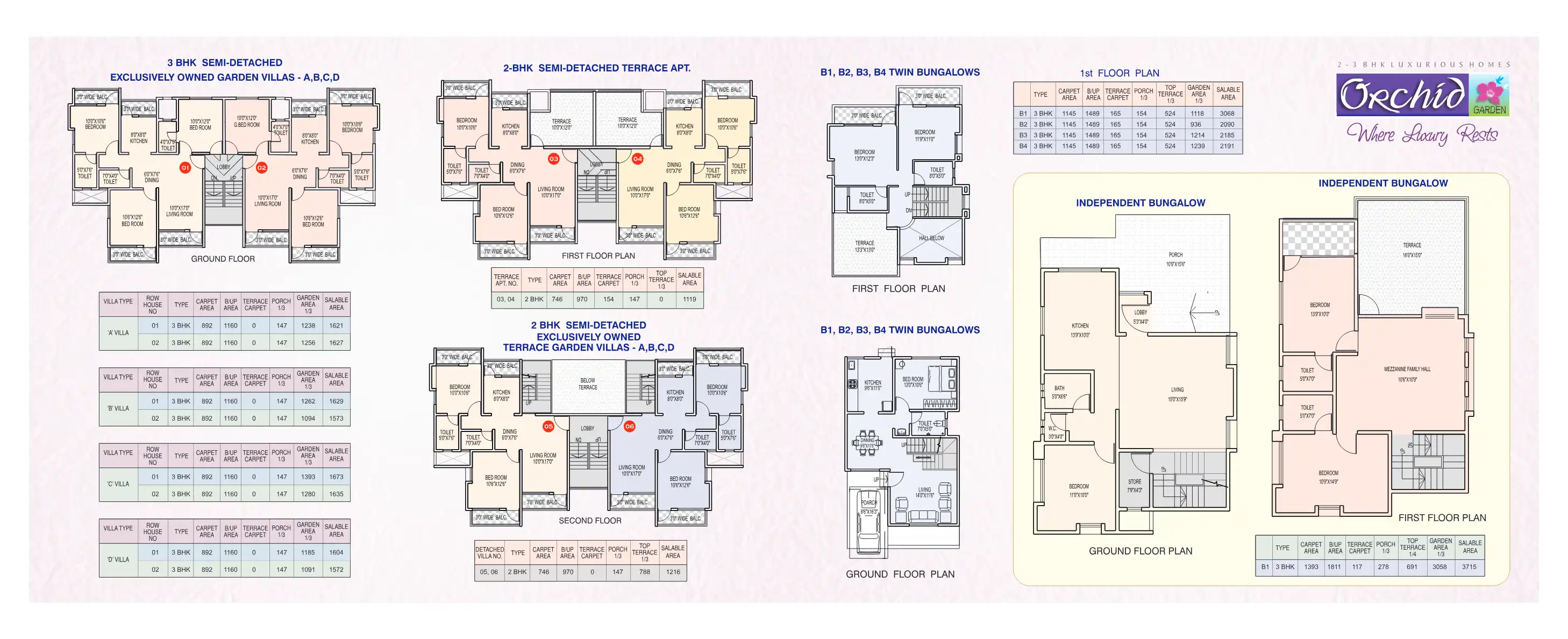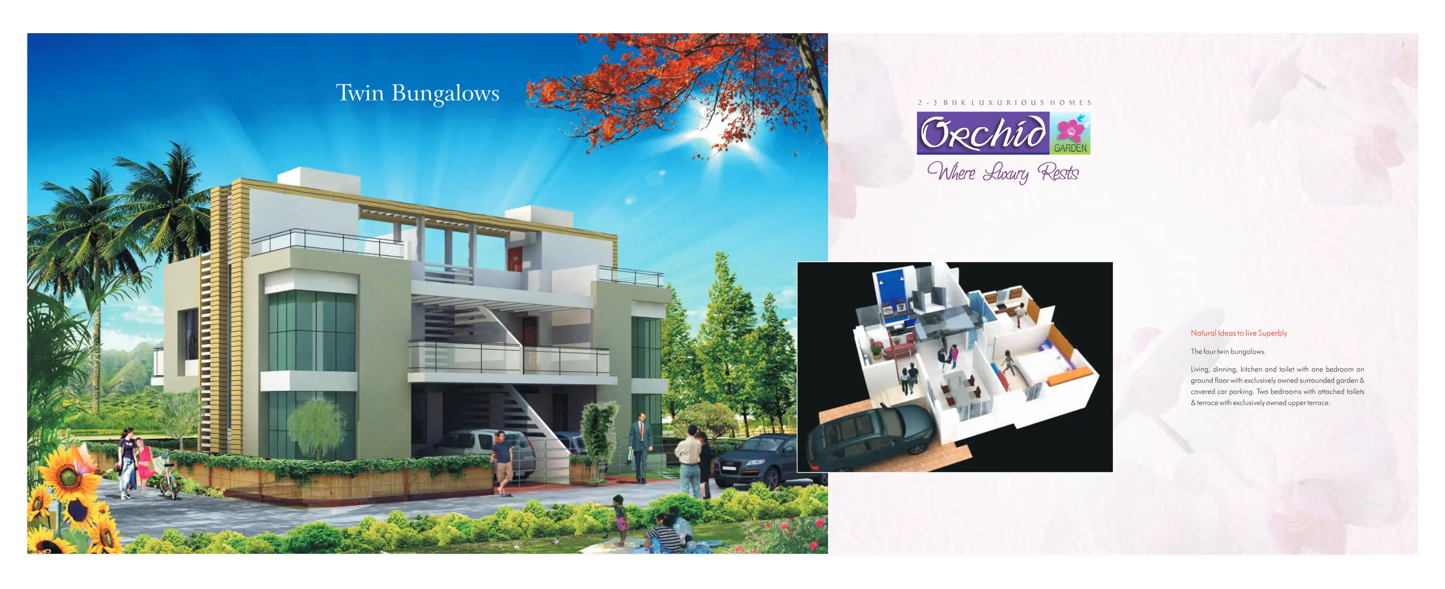 "Orchid Gardens" is a unique combination of Independent Semi Detached 3BHK Villas with independent exclusively owned garden, Bungalows, 2BHK Terrace Apartments on first floor & 2 BHK top Terrace apartments on second floor with independent exclusively...