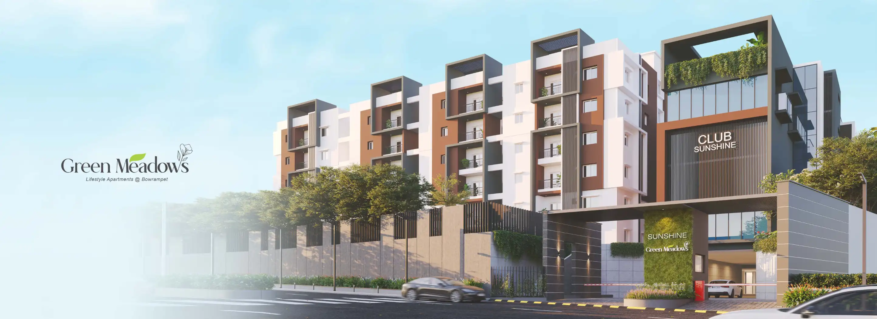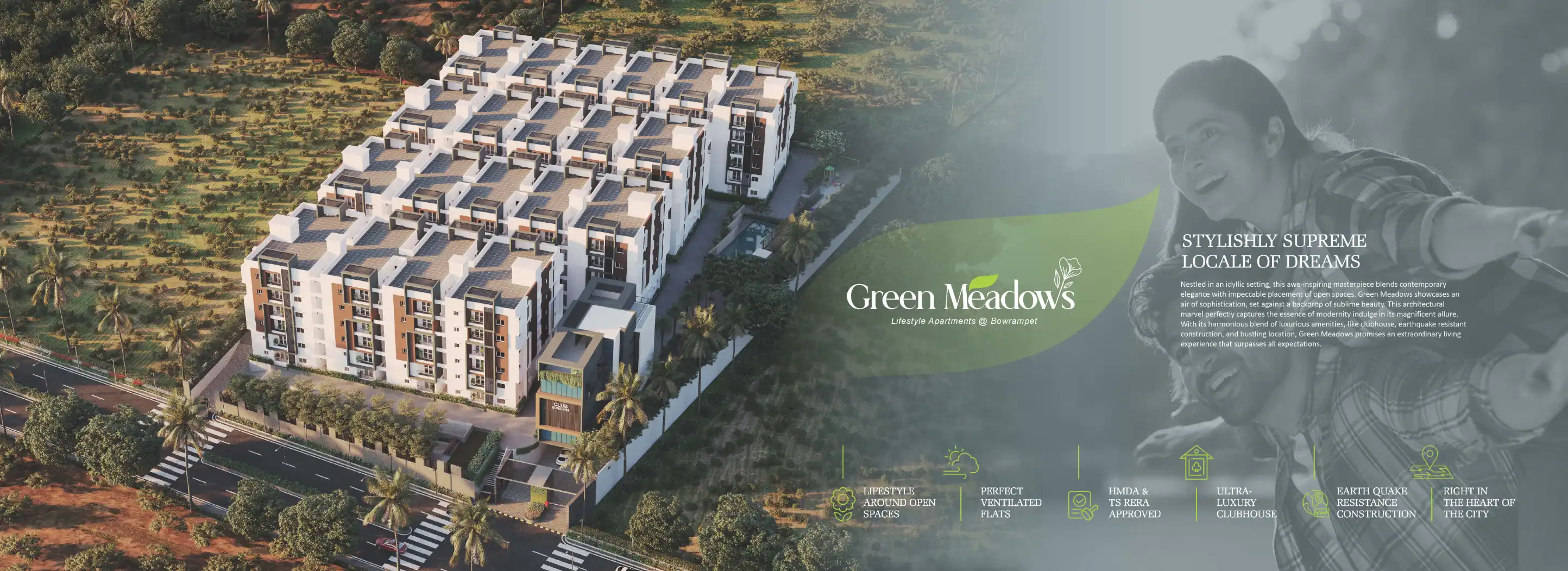 Spread across 2 acres 35 guntas in 4 blocks, this magnificent project epitomizes fulfilment. Green Meadows enjoys a prime location in Hyderabad's bustling urban landscape. This grand structure is a testament to masterful architecture, providing a ran...