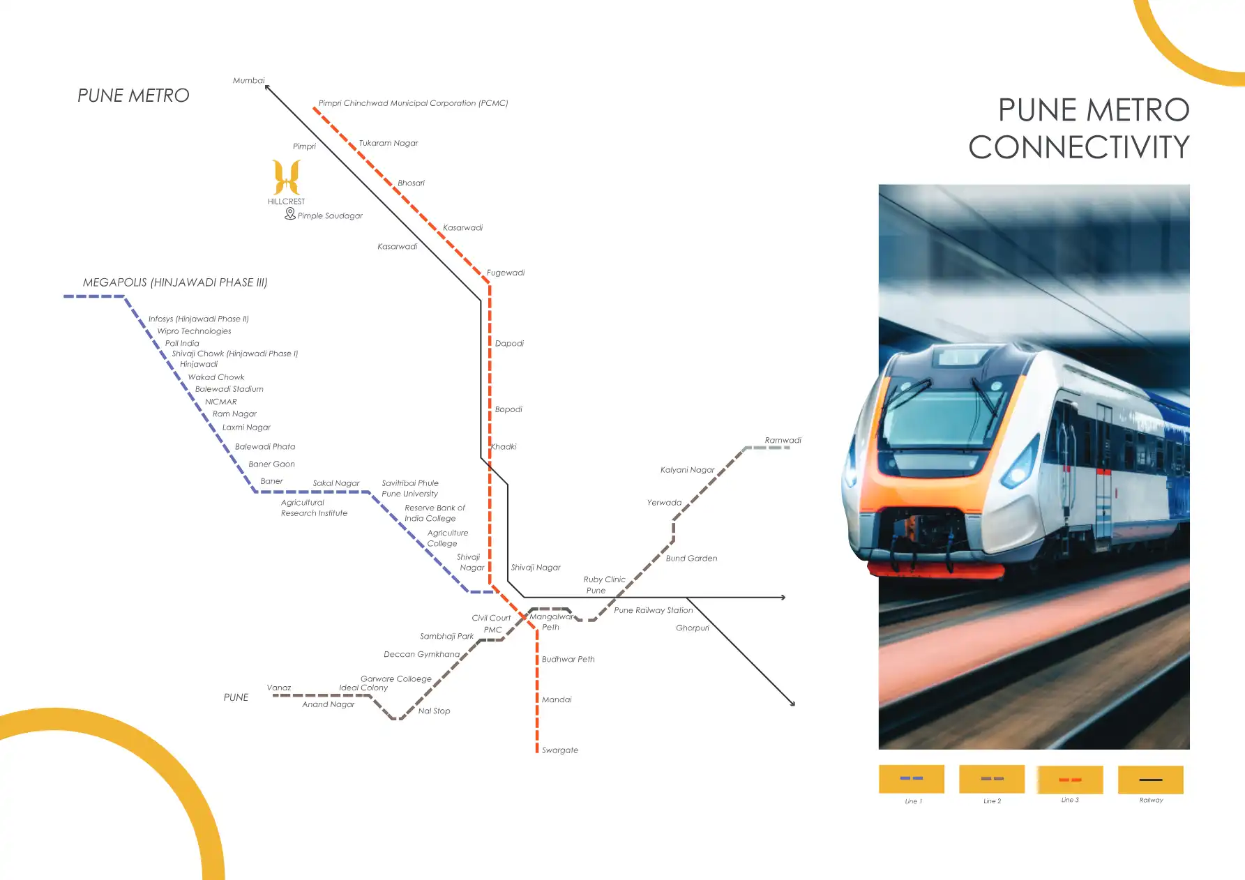 Pimple Saudagar enjoys robust connectivity to various parts of Pune and Pimpri-Chinchwad. It is well-served by PMPML buses, and the upcoming Metro-9 line will further enhance public transport. Major roads like the Mumbai-Pune Expressway and Aundh-Ravet Road provide seamless access, making commuting easy for residents.
