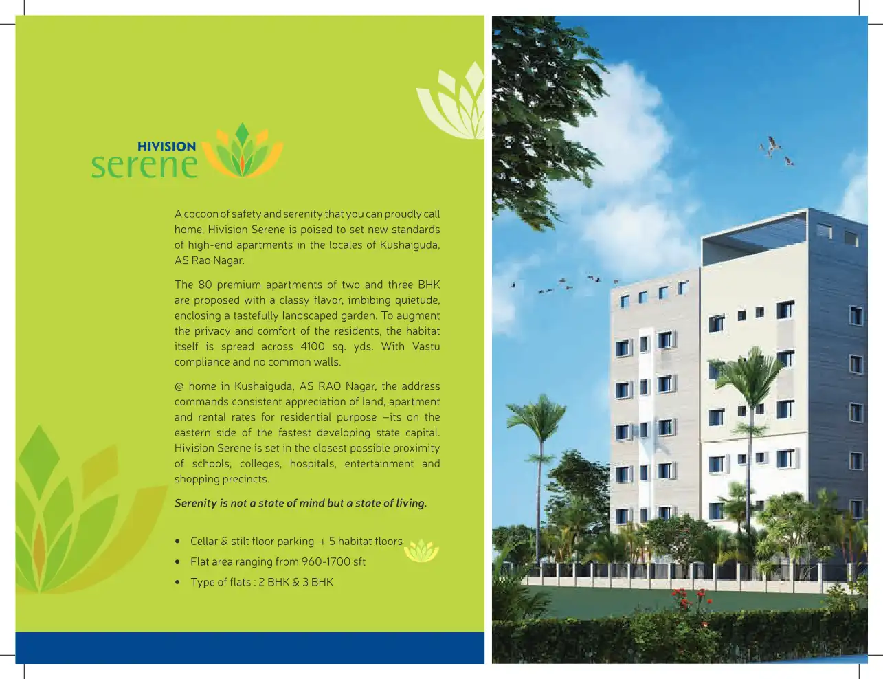 HIVISION Serene is poised to set new standards of high-end apartments in the locales of Kushaiguda, AS Rao Nagar. The 80 premium apartments of two and three BHK are proposed with a classy flavor.