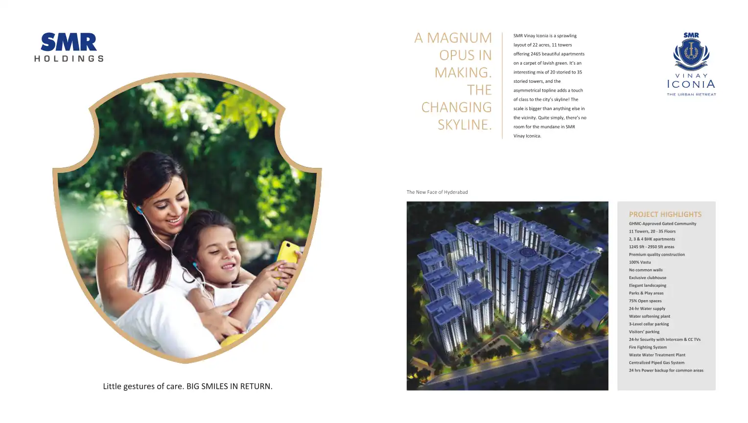 SMR Vinay Iconia emerges as the new face of Hyderabad by virtue of its magnitude and diversity in aspiration. The new urban retreat lets you enjoy life with family on a vast canvas. It represents the values on which Hyderabad was built and displays t...