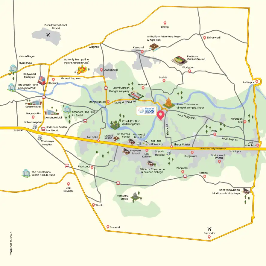 Island of Bliss in Theur is just 2 minutes from the Ashtavinayak Chintamani Ganpati temple, taking you closer to a spiritual life. Located on Loni-Wagholi Link Road, a fast-developing area with multiple infrastructure projects in the pipeline, it's w...