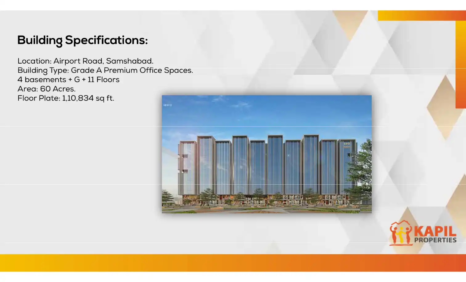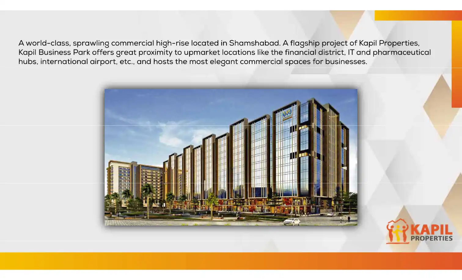 A world-class, sprawling commercial high-rise located in Shamshabad. A flagship project of Kapil Properties, Kapil Business Park offers great proximity to upmarket locations like the financial district, IT and pharmaceutical hubs, international airpo...