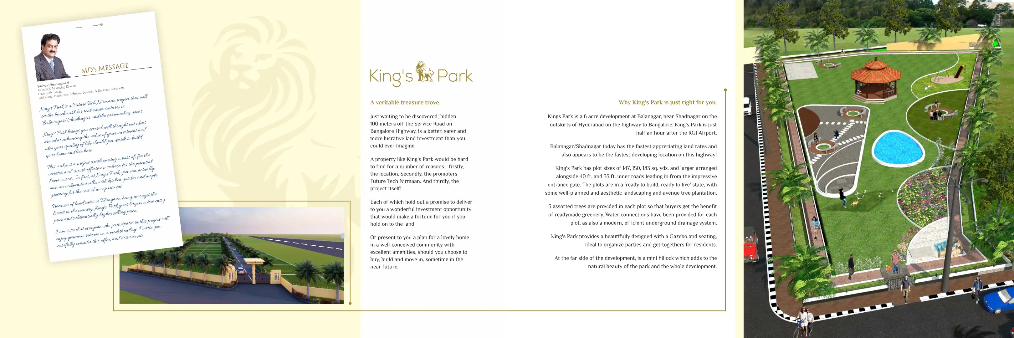 King's Park is a 6 acre development at Balanagar, near Shadnagar on the outskirts of Hyderabad on the highway to Bangalore. King's Park is just half an hour after the RGI Airport.