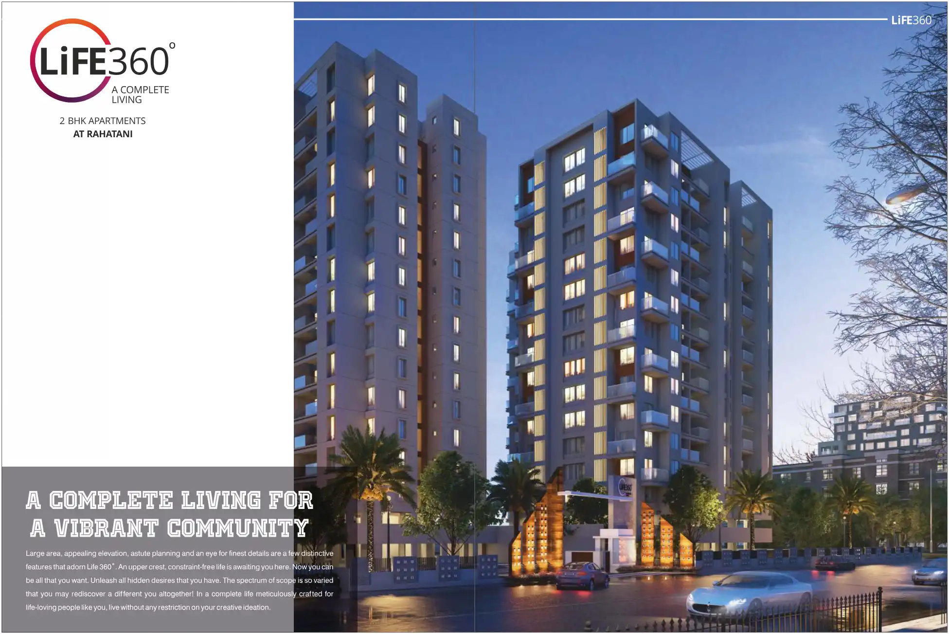 Large area, appealing elevation, astute planning and an eye for finest details are a few distinctive features that adorn Life 360°. An upper crest, constraint-free life is awaiting you here. Now you can be all that you want. Unleash all hidden desire...