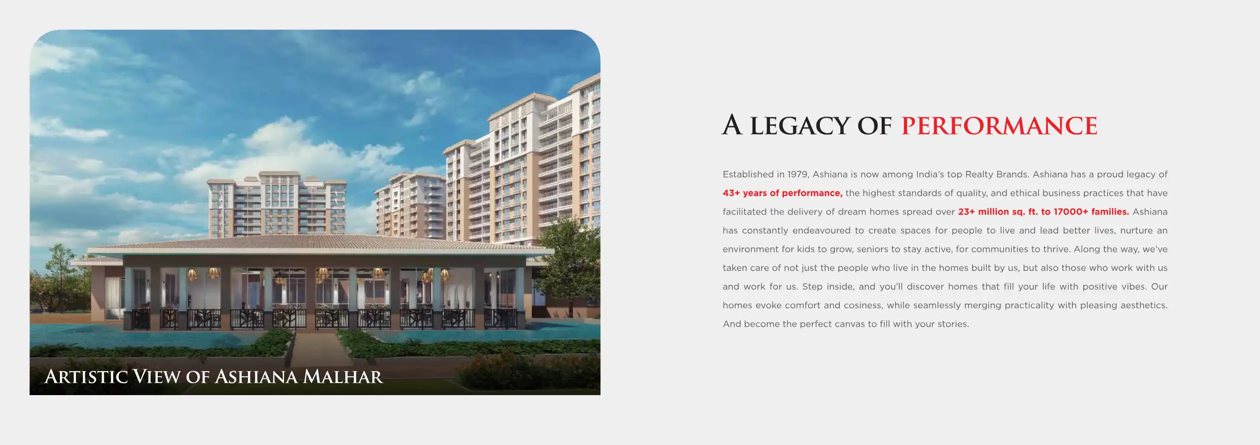 Ashiana has constantly endeavoured to create spaces for people to live and lead better lives, nurture an environment for kids to grow, seniors to stay active, for communities to thrive.