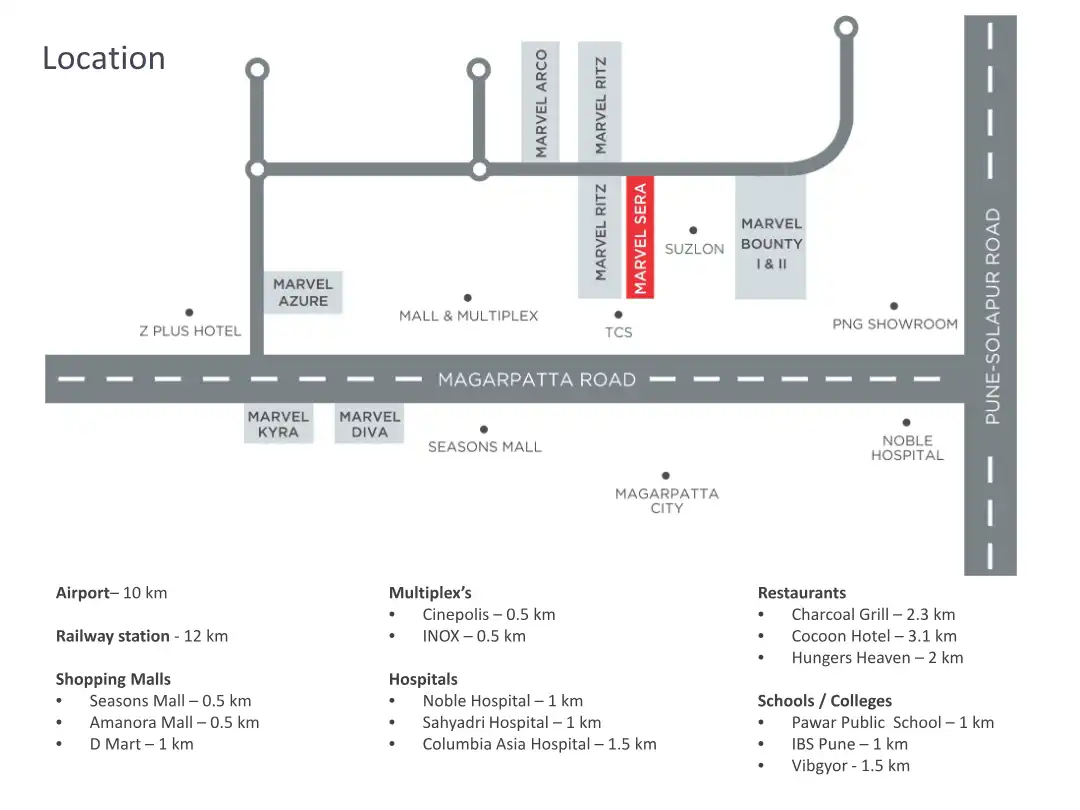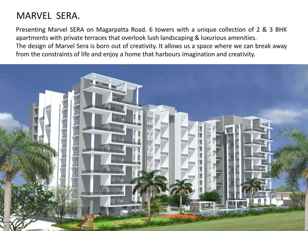 Marvel SERA on Magarpatta Road. 6 towers with a unique collection of 2 & 3 BHK apartments with private terraces that overlook lush landscaping & luxurious amenities. The design of Marvel Sera is born out of creativity. It allows us a space where we c...
