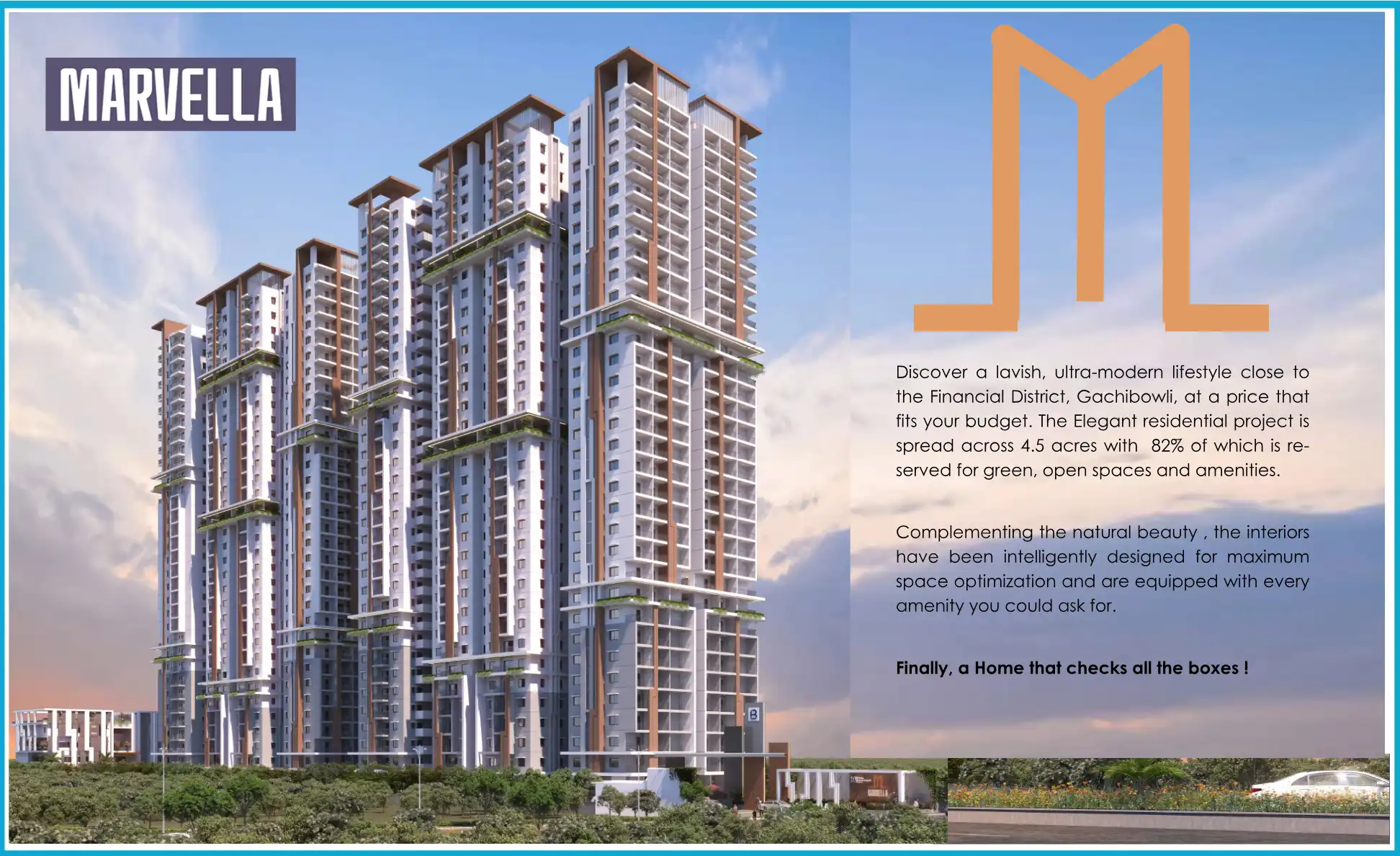 Discover a lavish, ultra-modern lifestyle close to the Financial District, Gachibowli, at a price that fits your budget. The Elegant residential project is spread across 4.5 acres with 82% of which is re- served for green, open spaces and amenities.