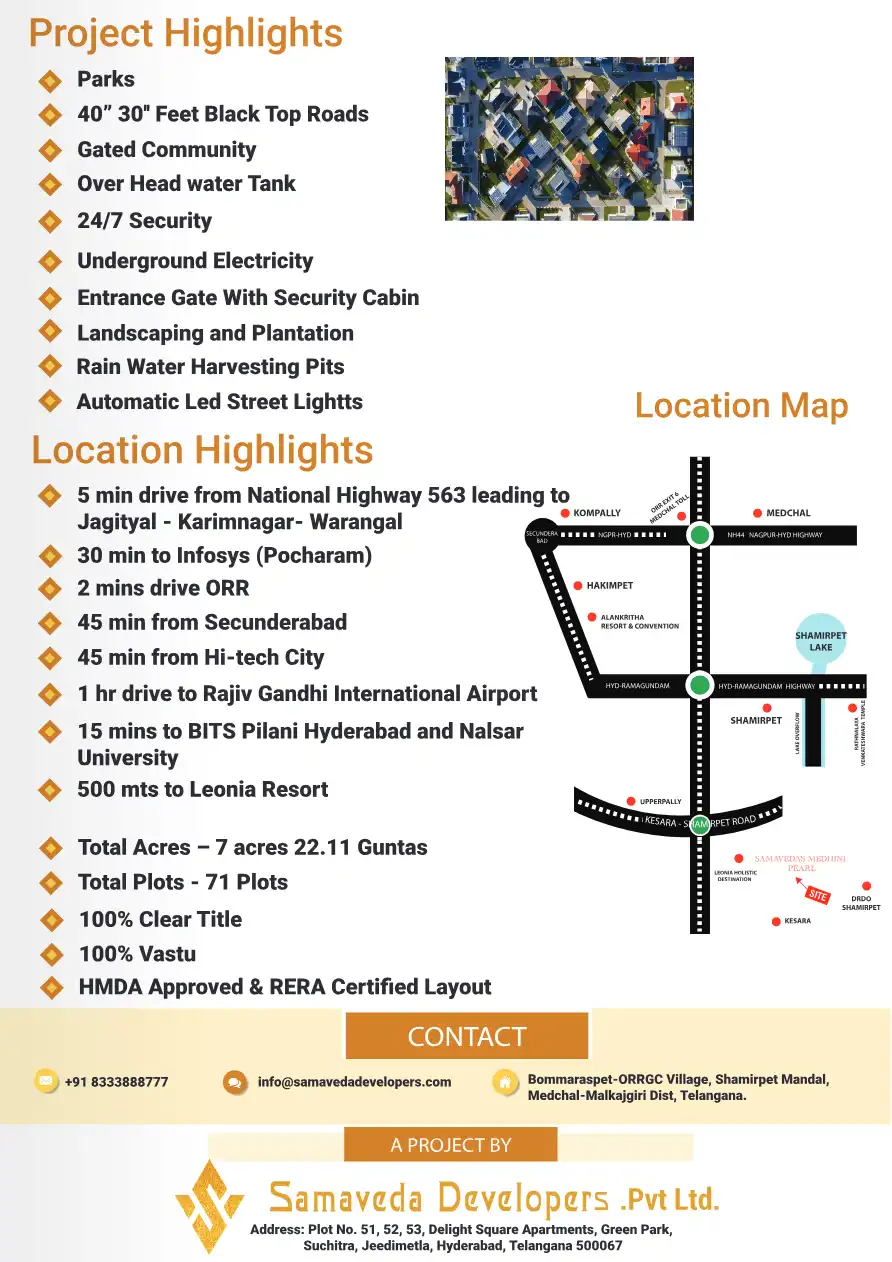 Shamirpet presents strong investment prospects due to its strategic location, ongoing infrastructure development, and serene environment. The presence of educational institutions, resorts, and upcoming residential projects like Parijatha Pride by Parijatha Homes and S.S. Residency by Shantashriram Constructions indicates a growing demand, promising good returns on investment in both plots and apartments.