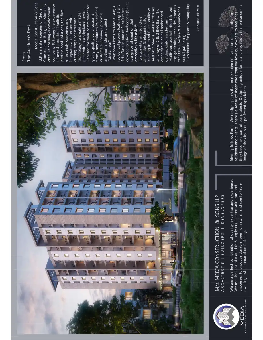 Welcome Home to Media Leaf, a residential project featuring 1 & 2 BHK Flats in one of Pune's most coveted location Ambegaon (bk). It is a graceful creation that embodies a lifestyle & functionality with top class amenities & elegant design.