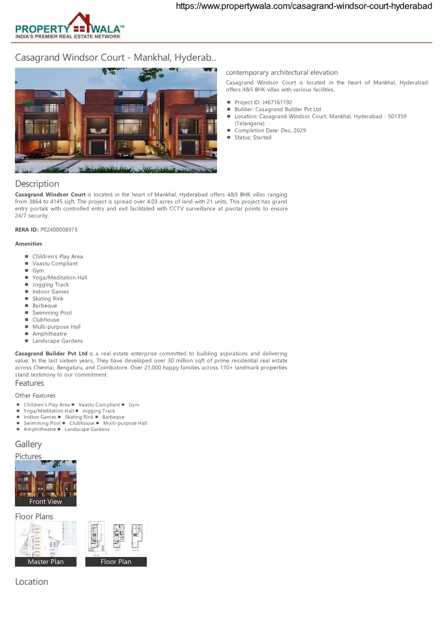 Casagrand Windsor Court is located in the heart of Mankhal, Hyderabad offers 4&5 BHK villas ranging from 3864 to 4145 sqft. The project is spread over 4.03 acres of land with 21 units. This project has grand entry portals with controlled entry and ex...