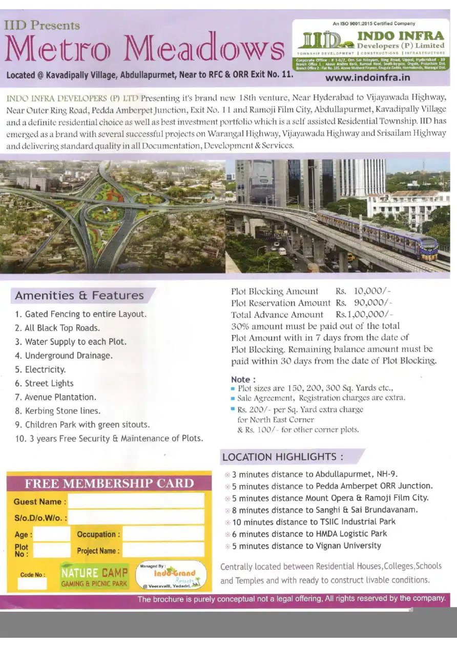 INDO INFRA DEVELOPERS (P) LTD Presenting it's brand new 18th venture, Near Hyderabad to Vijayawada Highway, Near Outer Ring Road, Pedda Amberpet Junction, Exit No. 11 and Ramoji Film City, Abdullapurmet, Kavadipally Village and a definite residential...