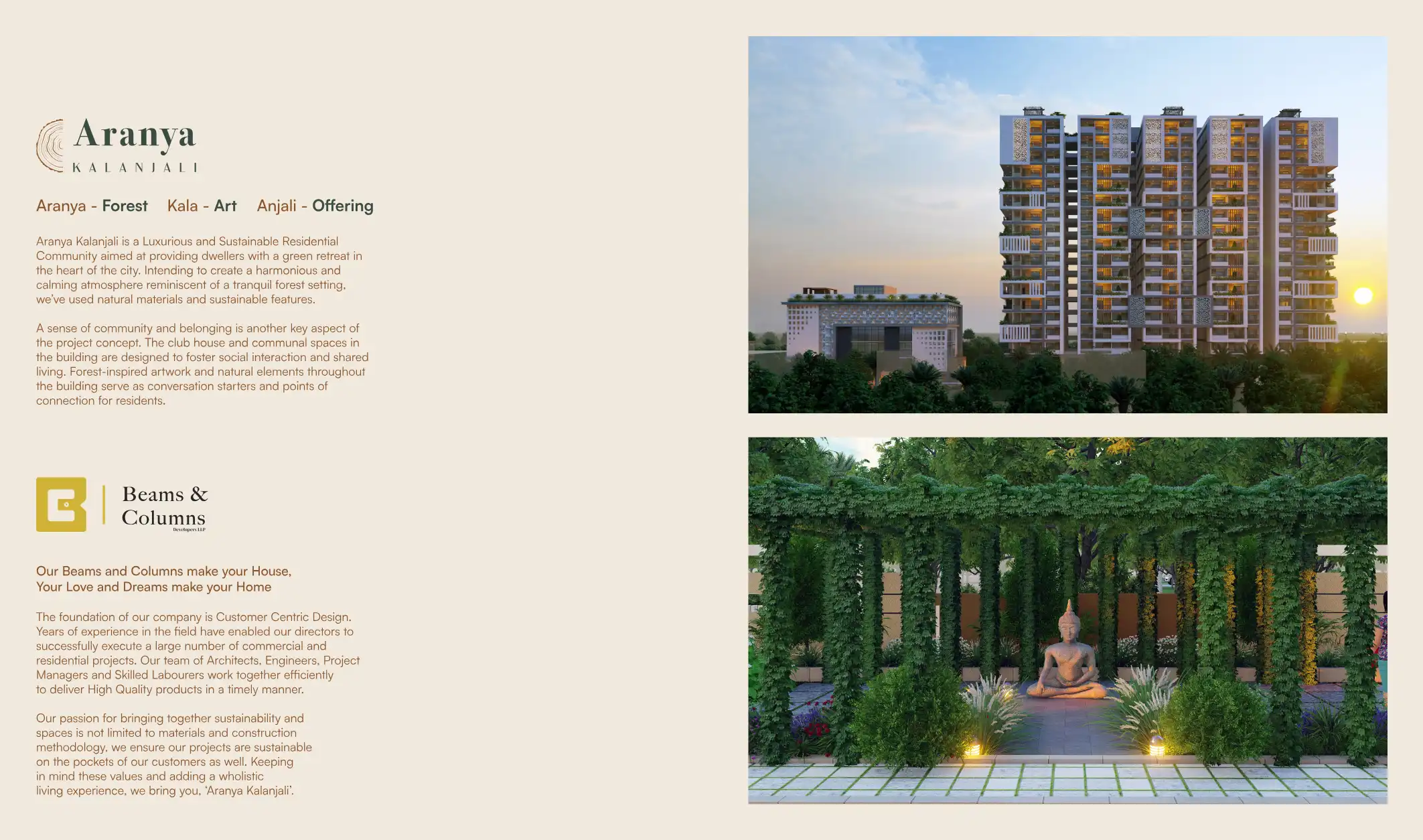 Aranya Kalanjali is a Luxurious and Sustainable Residential Community aimed at providing dwellers with a green retreat in the heart of the city. Intending to create a harmonious and calming atmosphere reminiscent of a tranquil forest setting, we've u...