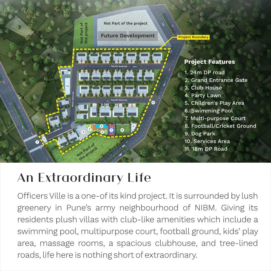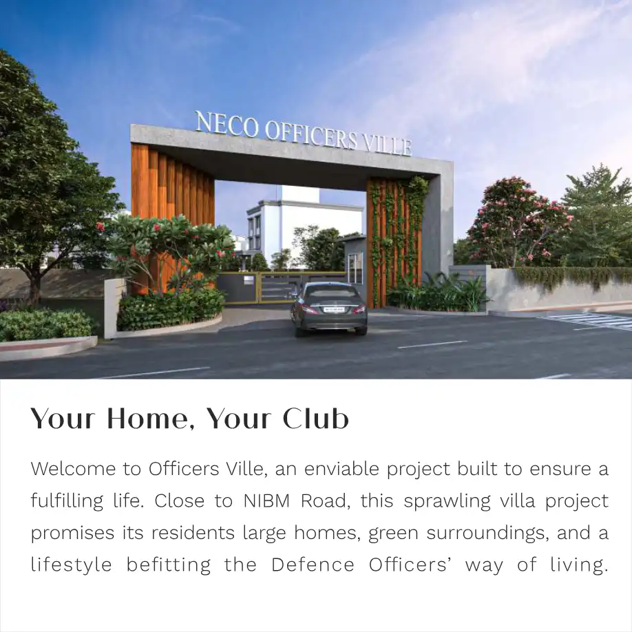 Officers Ville is a one-of its kind project. It is surrounded by lush greenery in Pune's army neighbourhood of NIBM. Giving its residents plush villas with club-like amenities which include a swimming pool, multipurpose court, football ground, kids' ...
