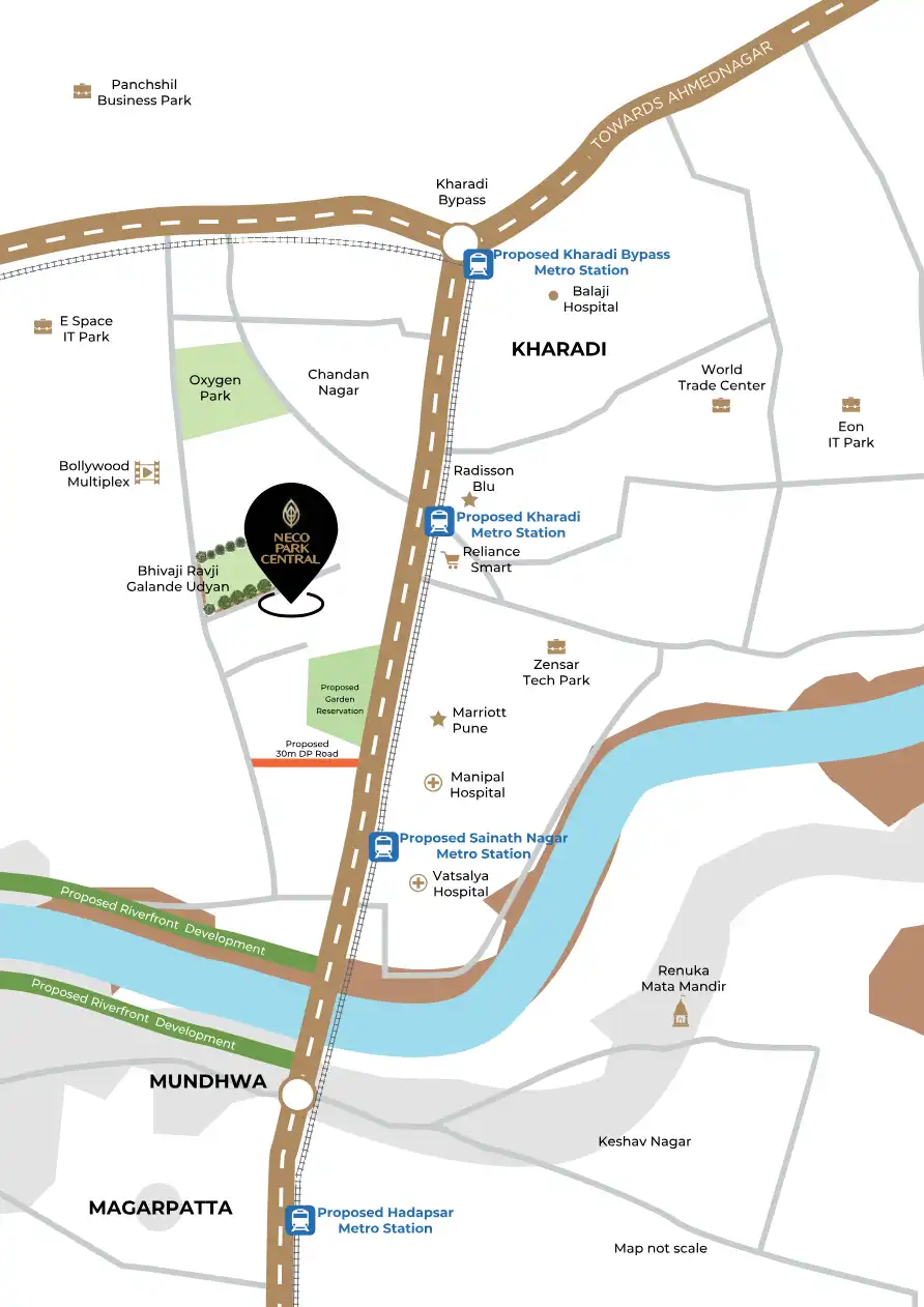 Mundhwa is a prominent residential and commercial locality situated in the eastern part of Pune. It is strategically positioned near major IT hubs like Hadapsar and Kharadi, making it a preferred choice for professionals. Its proximity to the Mula-Mutha River also adds to its appeal, offering a blend of urban convenience and natural surroundings.