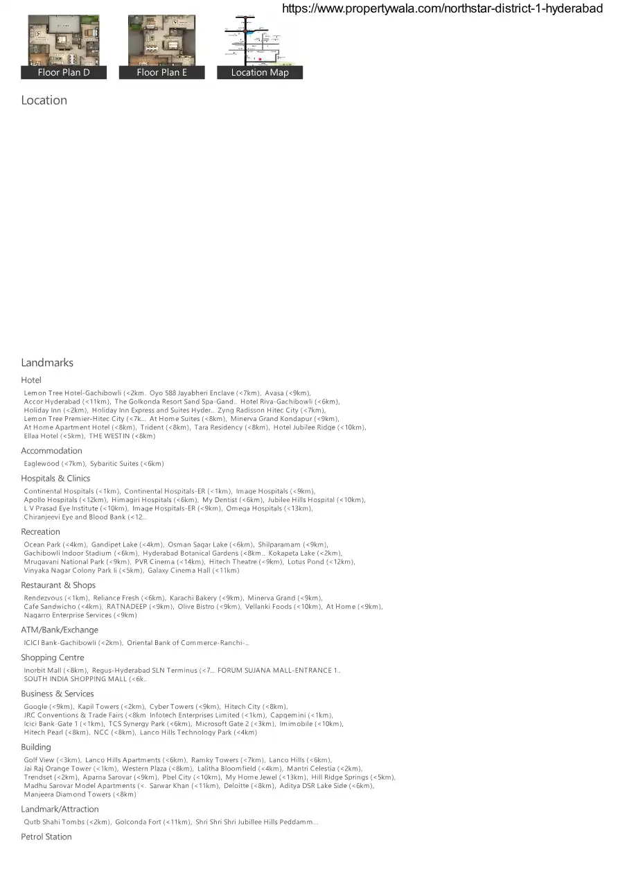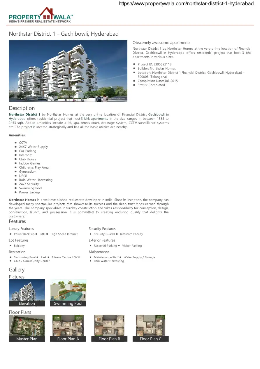 Northstar District 1 by Northstar Homes at the very prime location of Financial District, Gachibowli in Hyderabad offers residential project that host 3 bhk apartments in the size ranges in between 1535 to 2453 sqft. Added amenities include a lift, s...