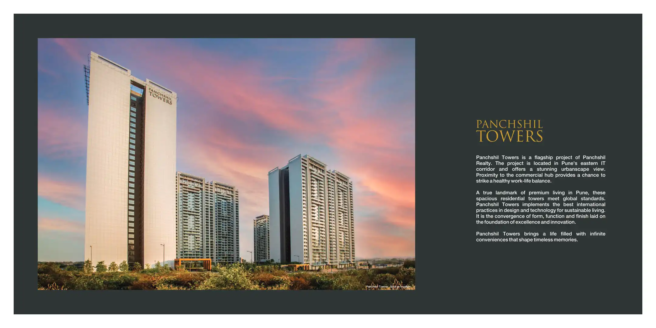 Panchshil Towers is a flagship project of Panchshil Realty. The project is located in Pune's eastern IT corridor and offers a stunning urbanscape view. Proximity to the commercial hub provides a chance to strike a healthy work-life balance. A true la...