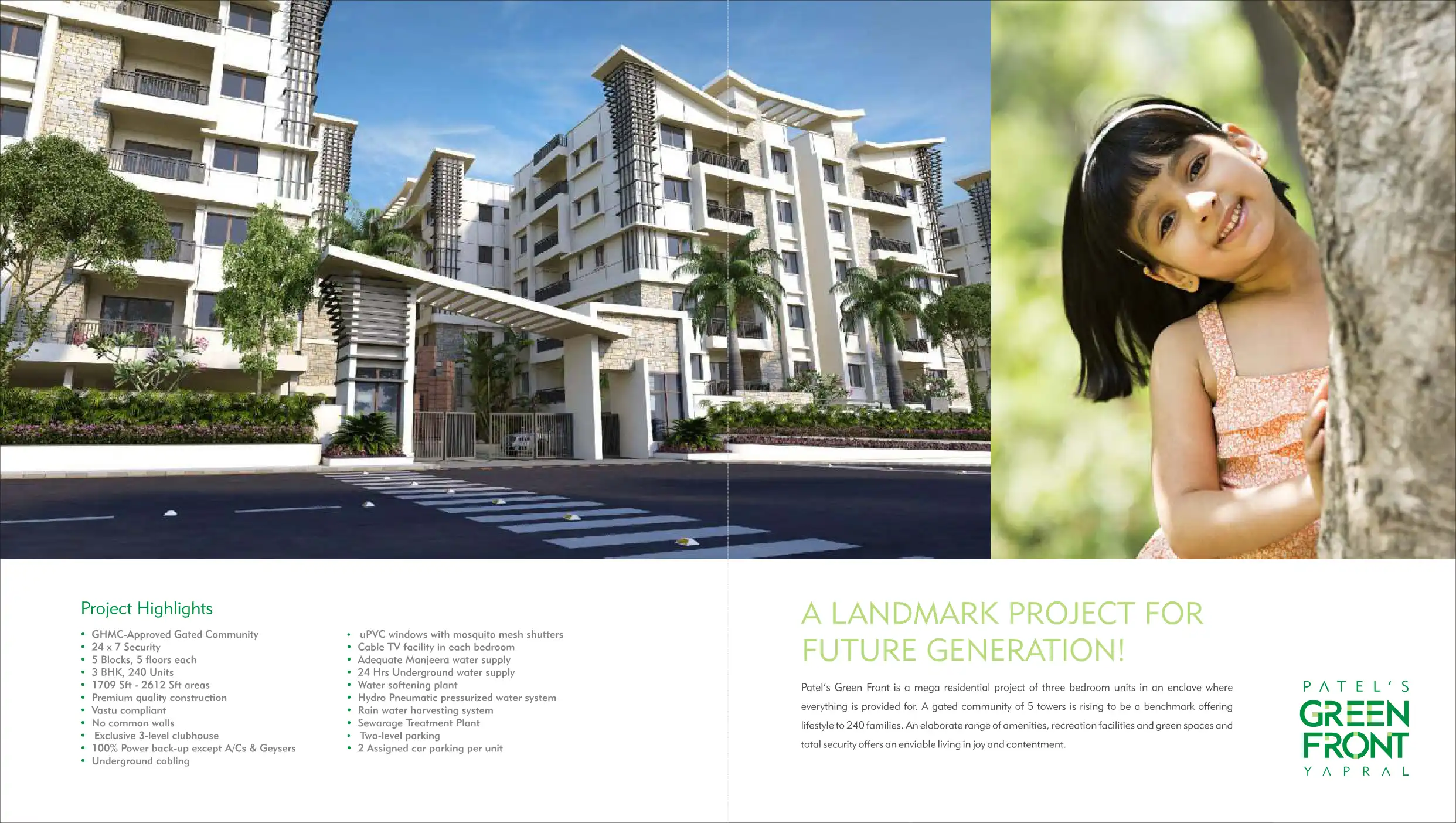 Patel's Green Front is a mega residential project of three bedroom units in an enclave where everything is provided for. A gated community of 5 towers is rising to be a benchmark offering lifestyle to 240 families. An elaborate range of amenities, re...
