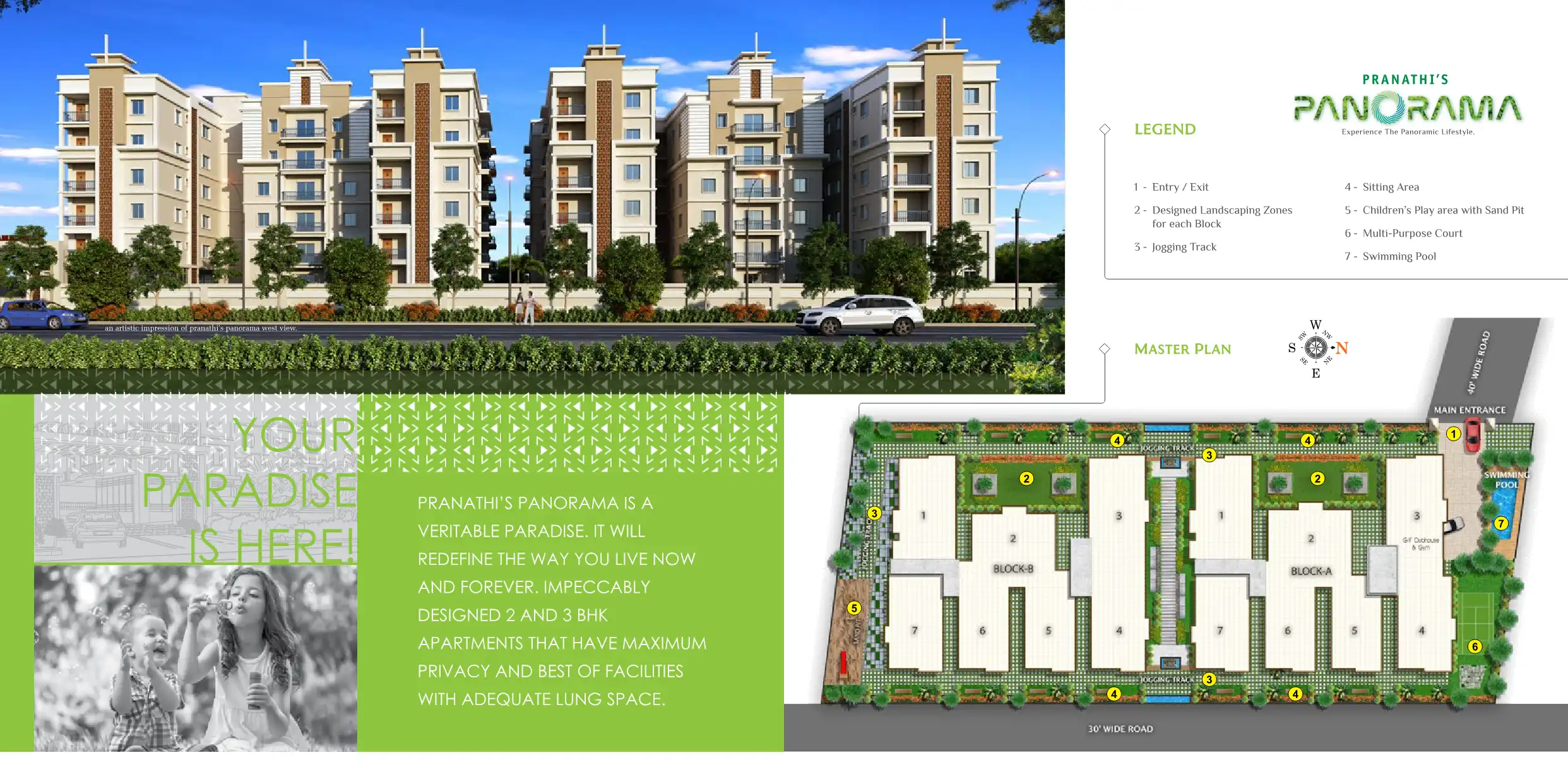 PRANATHI'S PANORAMA IS A VERITABLE PARADISE. IT WILL REDEFINE THE WAY YOU LIVE NOW AND FOREVER. IMPECCABLY DESIGNED 2 AND 3 BHK APARTMENTS THAT HAVE MAXIMUM PRIVACY AND BEST OF FACILITIES WITH ADEQUATE LUNG SPACE.