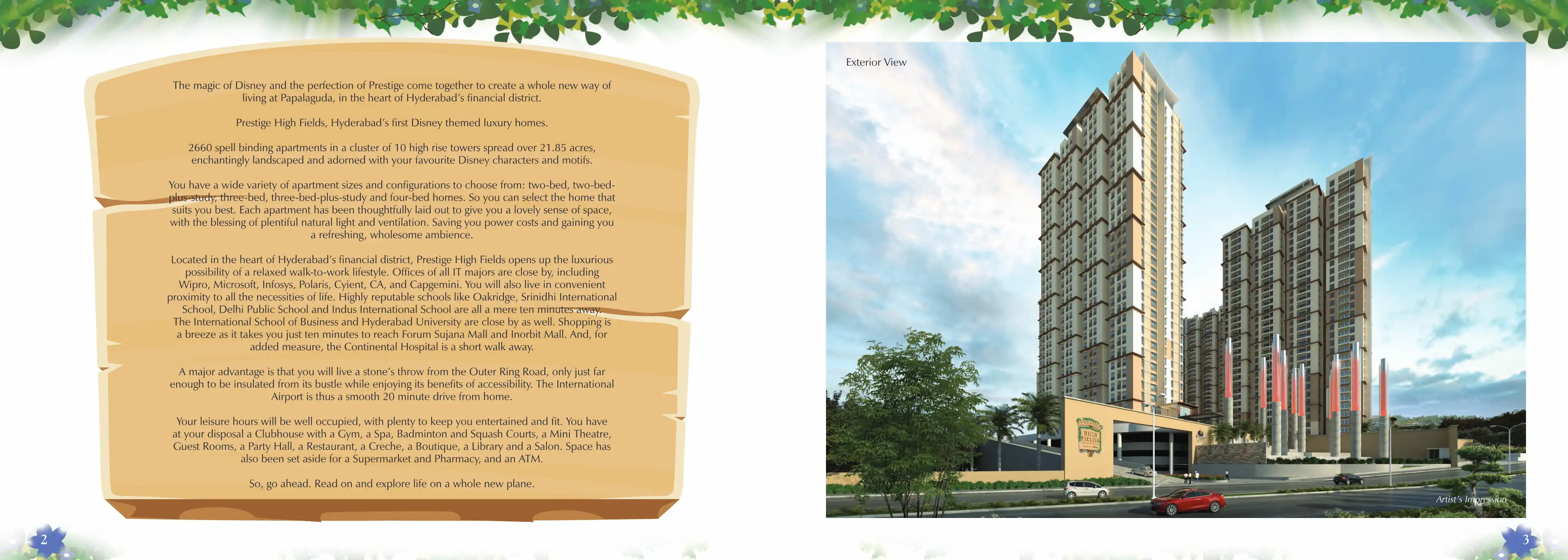 Prestige High Fields, Hyderabad's first Disney themed luxury homes.2660 spell binding apartments in a cluster of 10 high rise towers spread over 21.85 acres, enchantingly landscaped and adorned with your favourite Disney characters and motifs.