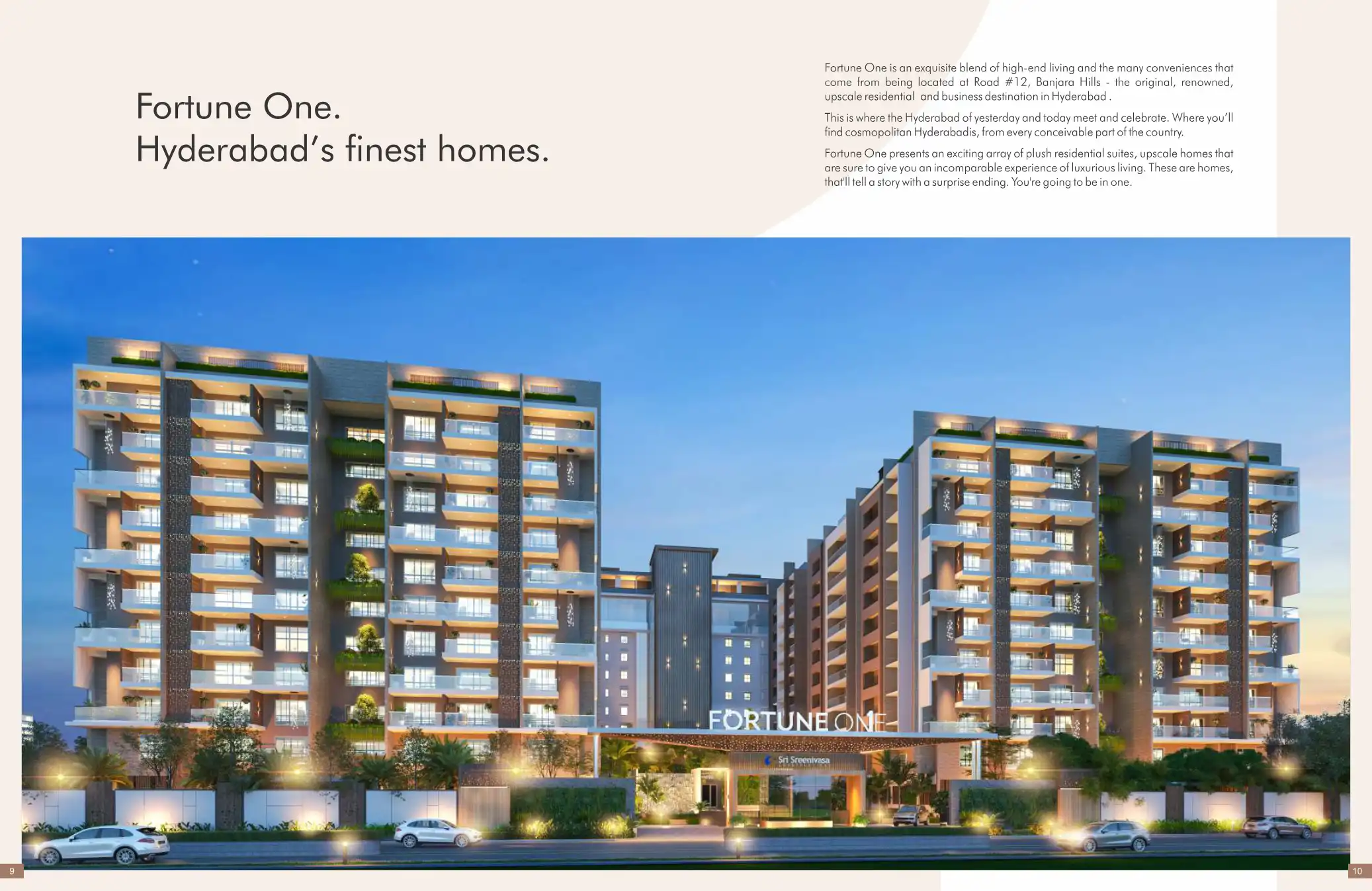Fortune One is an exquisite blend of high-end living and the many conveniences that come from being located at Road #12, Banjara Hills the original, renowned, upscale residential and business destination in Hyderabad.