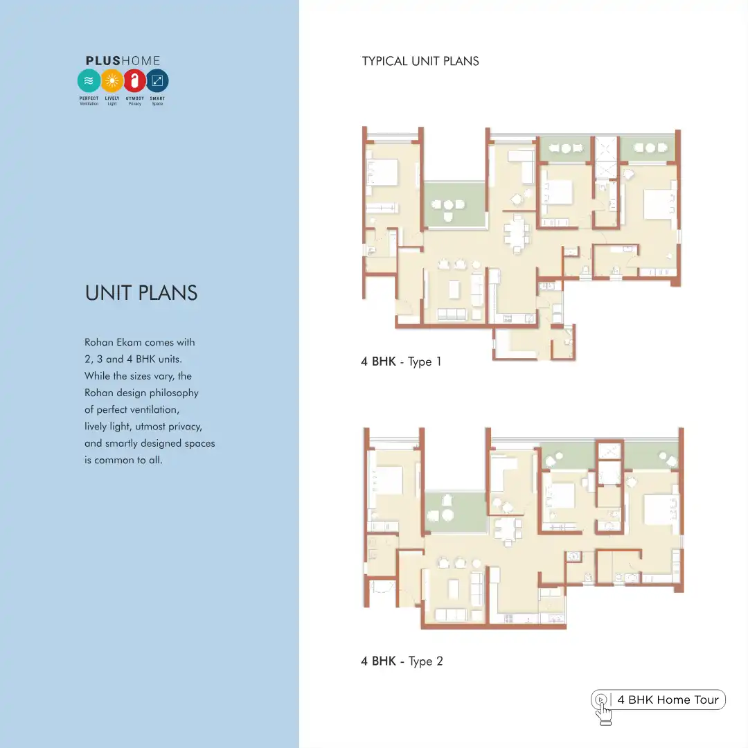 With the choice of 2, 3, and 4-bedroom apartments across 9 towers, homes at Rohan Ekam are all built to Rohan's PLUS design philosophy-perfect ventilation, lively light, utmost privacy, and smartly designed spaces.