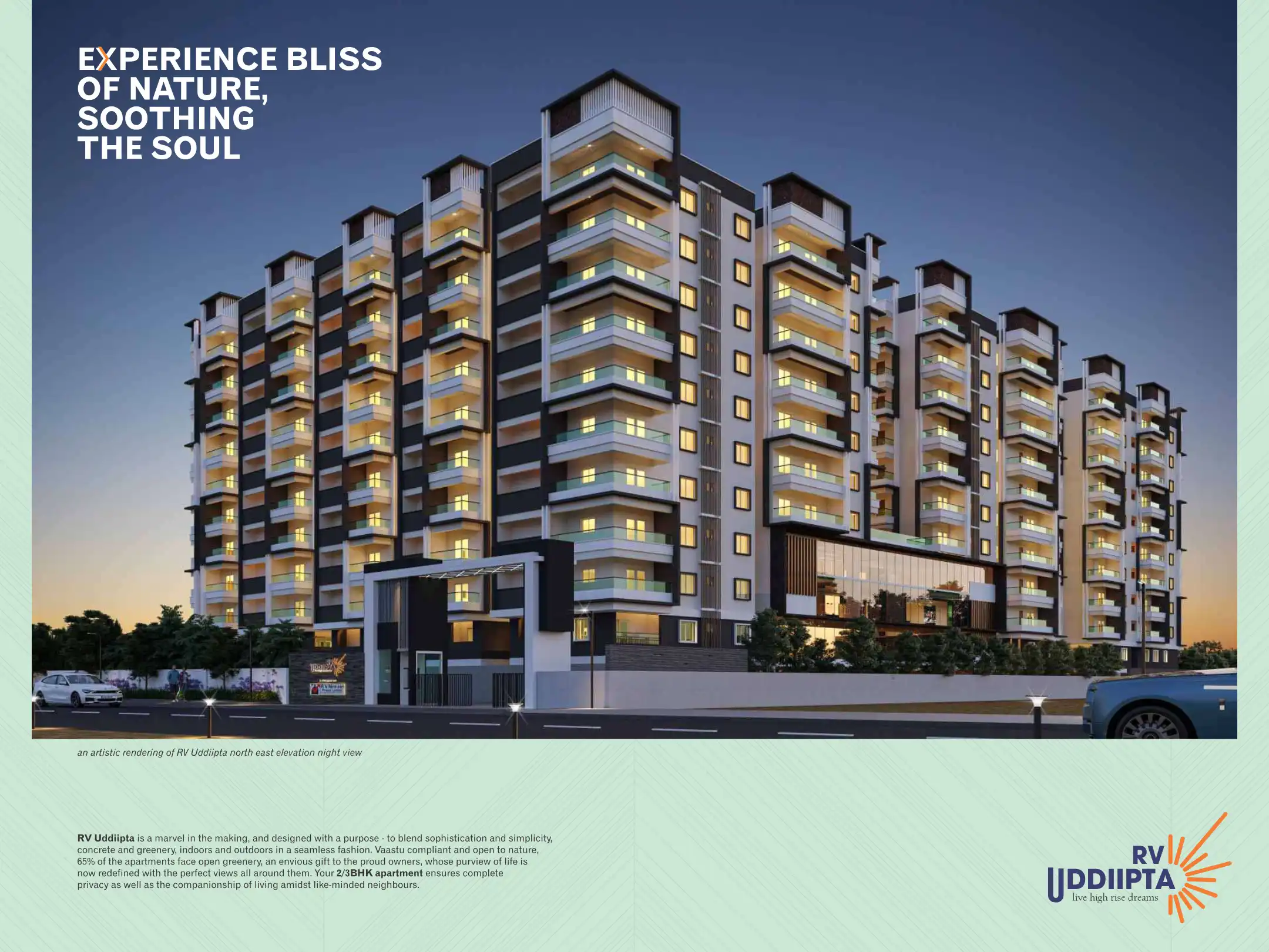 RV Uddiipta is a marvel in the making, and designed with a purpose - to blend sophistication and simplicity, concrete and greenery, indoors and outdoors in a seamless fashion. Vaastu compliant and open to nature, 65% of the apartments face open green...
