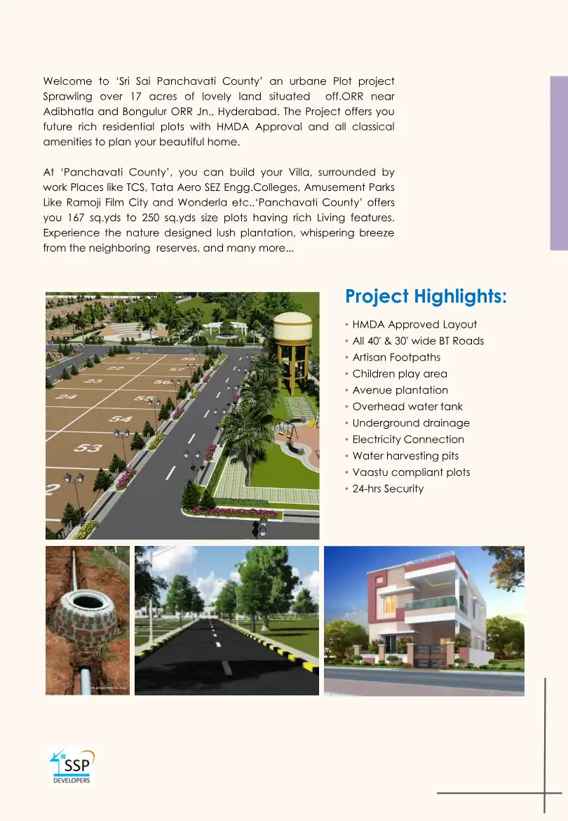 An urbane Plot project Sprawling over 17 acres of lovely land situated off.ORR near Adibhatla and Bongulur ORR Jn., Hyderabad. The Project offers you future rich residential plots with HMDA Approval and all classical amenities to plan your beautiful ...