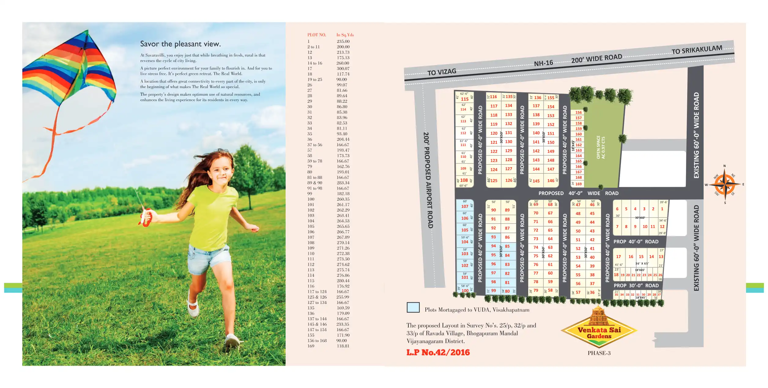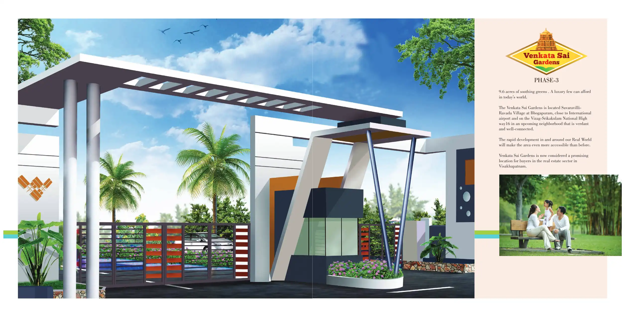 9.6 acres of soothing greens. The Venkata Sai Gardens is located Savaravilli- Ravada Village at Bhogapuram, close to International airport and on the Vizag-Srikakulam National High way16 in an upcoming neighborhood that is verdant and well-connected.