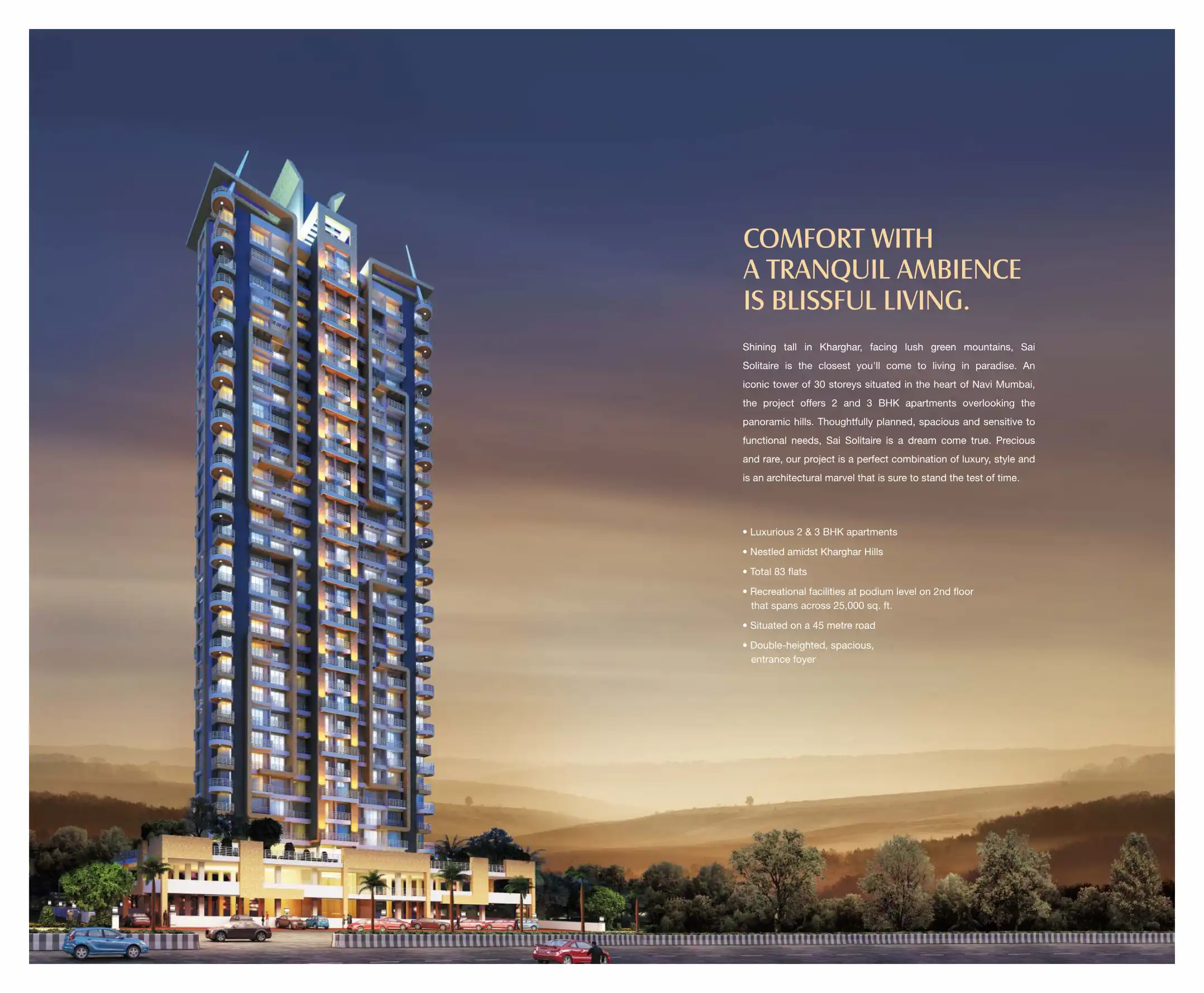 An iconic tower of 30 storeys situated in the heart of Navi Mumbai, the project offers 2 and 3 BHK apartments overlooking the panoramic hills.