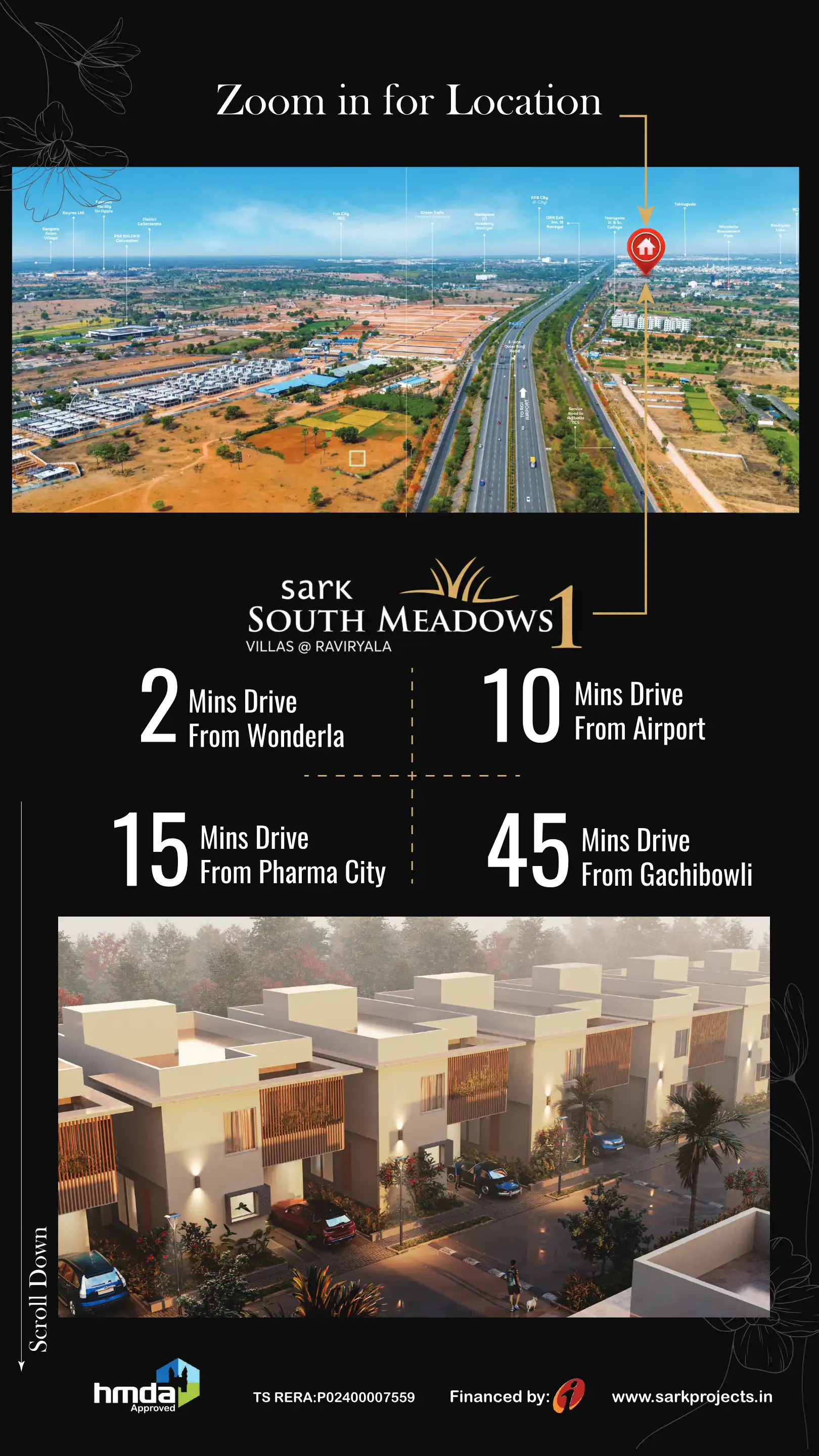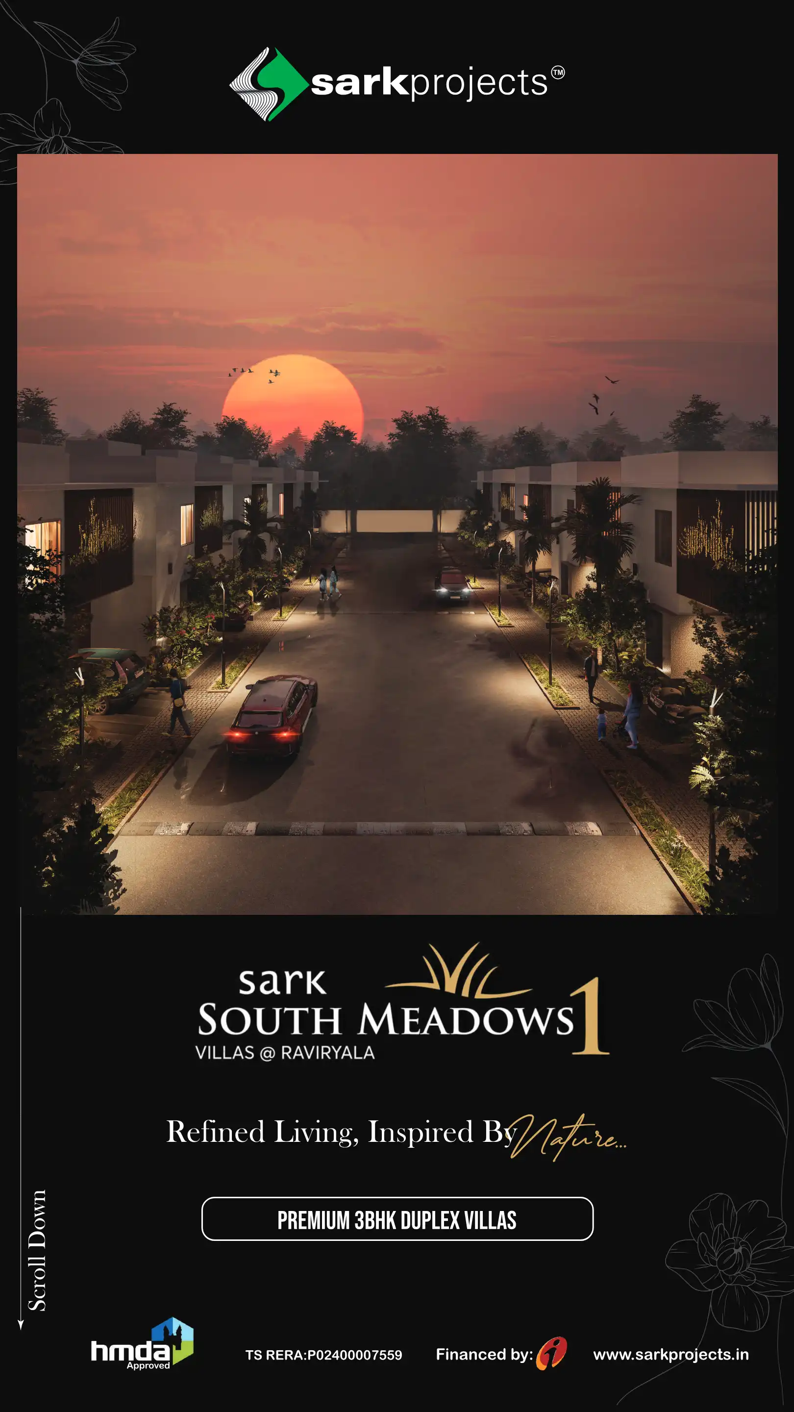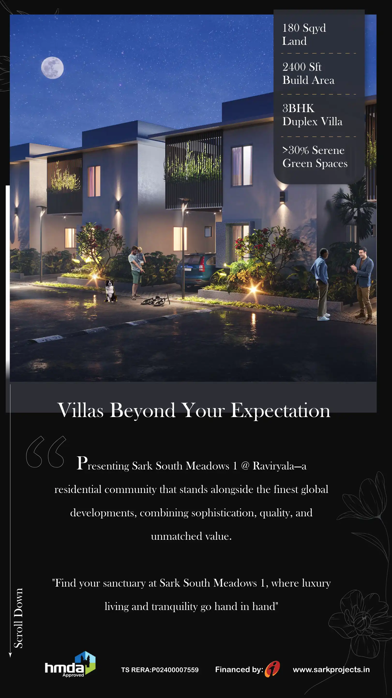 Presenting Sark South Meadows 1 @ Raviryala—a residential community that stands alongside the finest global developments, combining sophistication, quality, and unmatched value. Find your sanctuary at Sark South Meadows 1, where luxury living and tra...