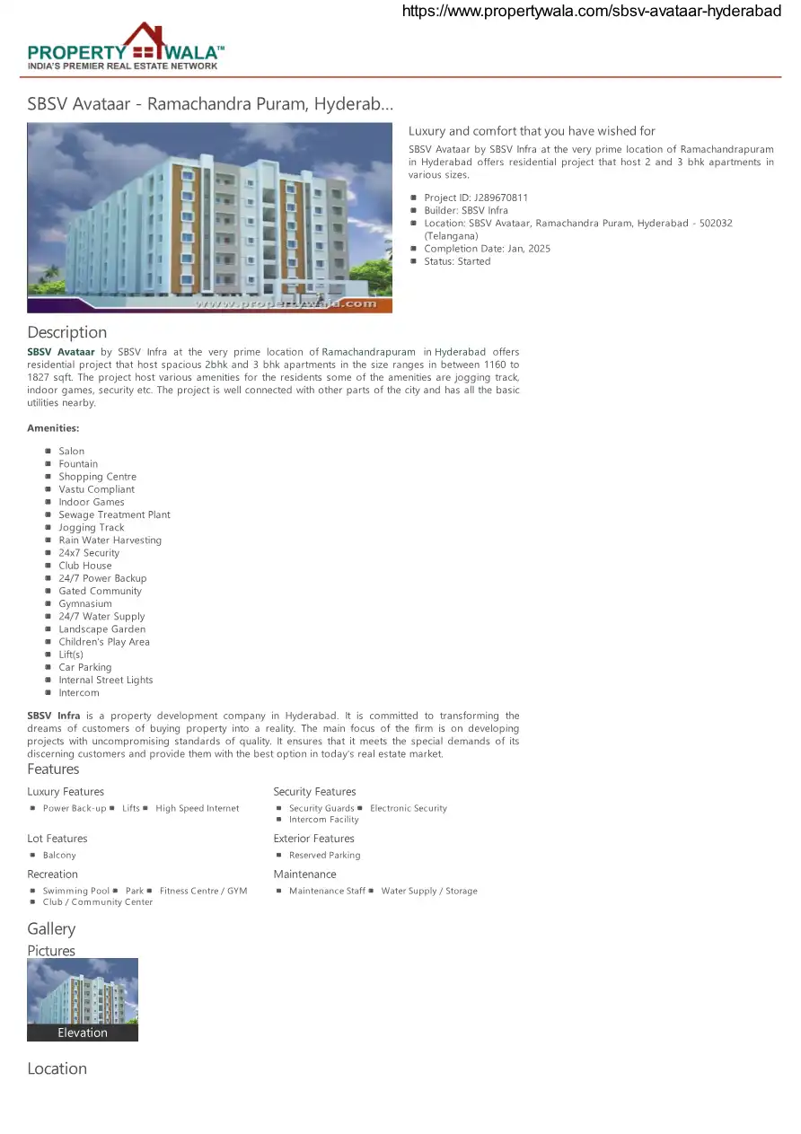 SBSV Avataar by SBSV Infra at the very prime location of Ramachandrapuram in Hyderabad offers residential project that host spacious 2bhk and 3 bhk apartments in the size ranges in between 1160 to 1827 sqft. The project host various amenities for the...