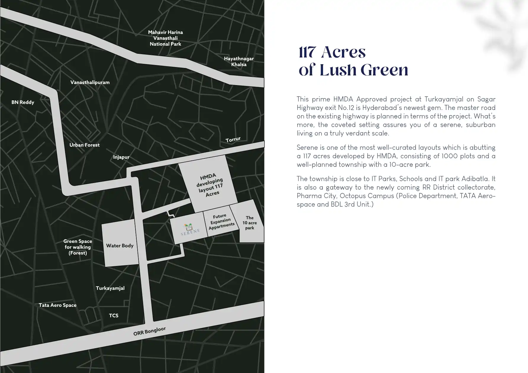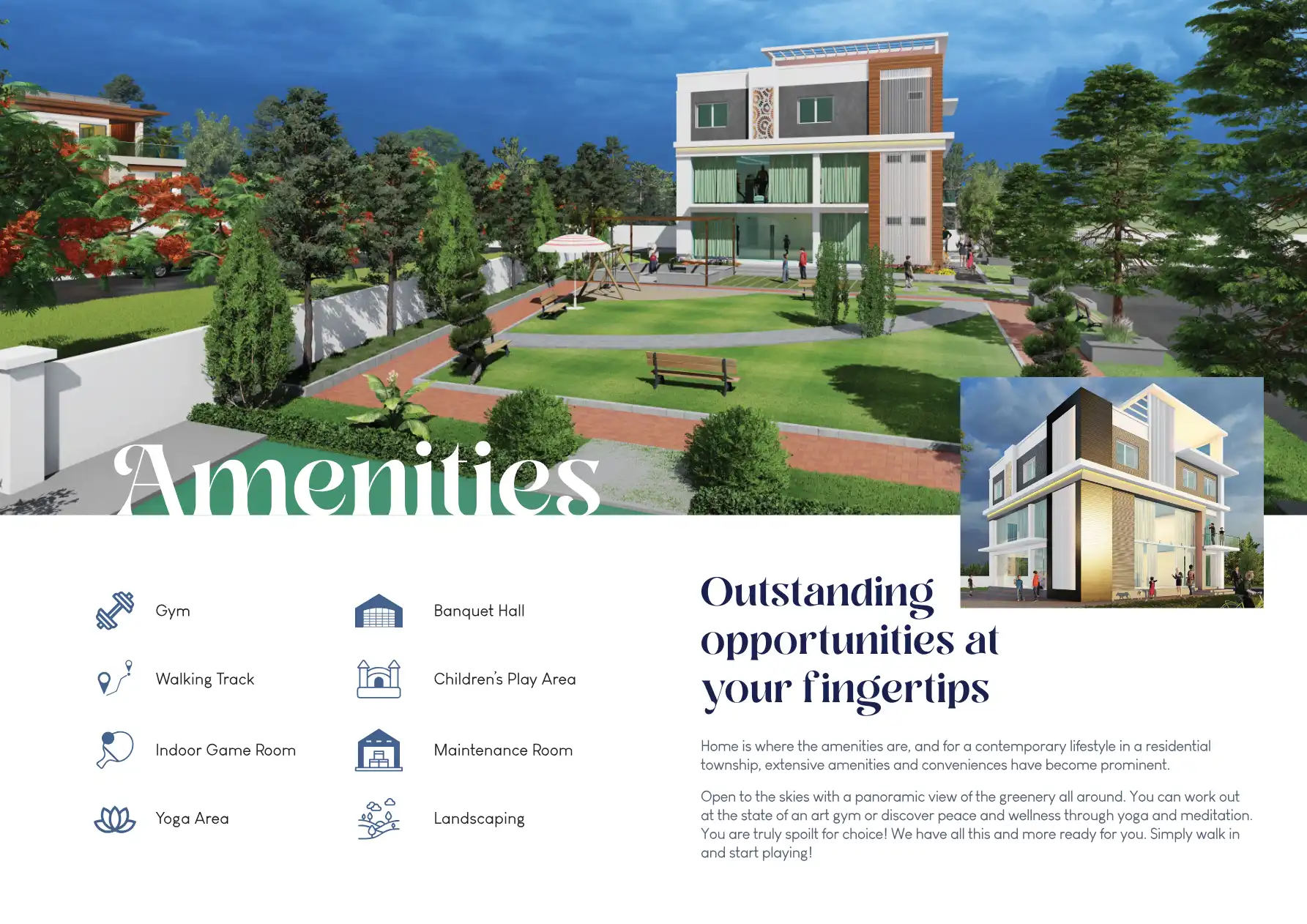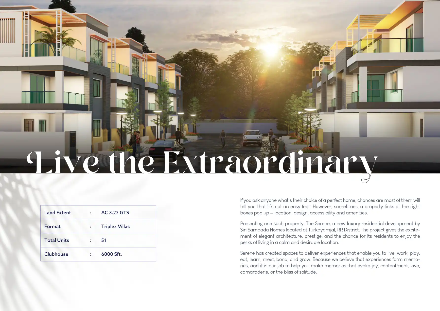 A new luxury residential development by Siri Sampada Homes located at Turkayamjal, RR District. The project gives the excite- ment of elegant architecture, prestige, and the chance for its residents to enjoy the perks of living in a calm and desirabl...