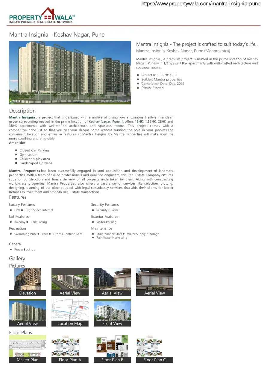 Mantra Insignia, a project that is designed with a motive of giving you a luxurious lifestyle in a clean green surrounding nestled in the prime location of Keshav Nagar, Pune. It offers 1BHK, 1.5BHK, 2BHK and 3BHK apartments with well-crafted archite...