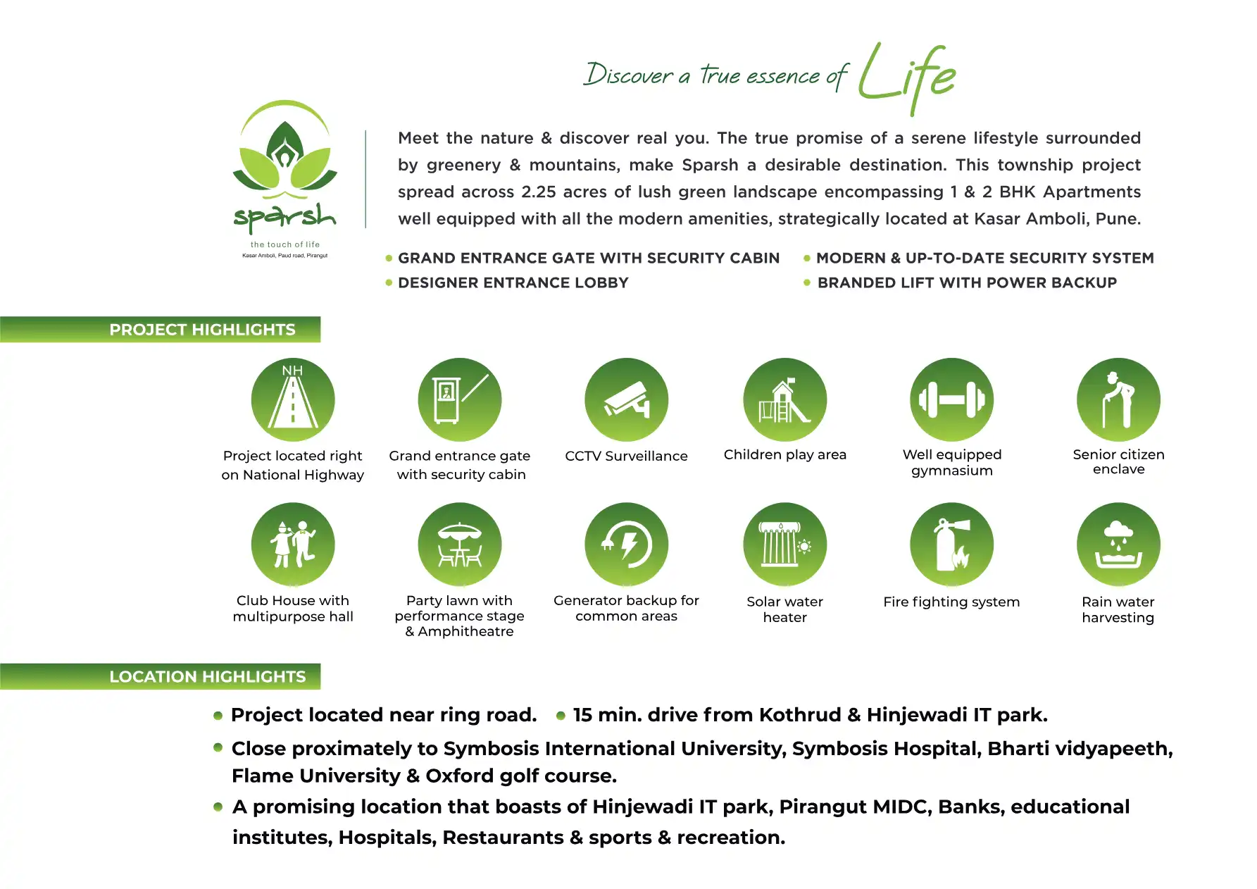 Sparsh - 1 & 2 BHK Residential Apartments at Kasar Amboli, Pirangut. These 252 Homes are perfectly spaced out in two buildings. Spanning over a wide expanse of 2.25 acres. These 1 & 2 BHK apartments are developed to maintain a fine balance between li...