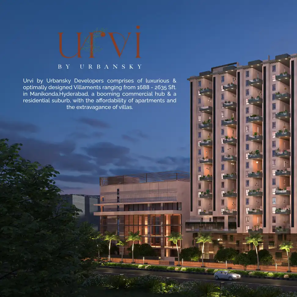 Urvi by Urbansky Developers comprises of luxurious & optimally designed Villaments ranging from 1688 - 2635 Sft. in Manikonda, Hyderabad, a booming commercial hub & a residential suburb, with the affordability of apartments and the extravagance of vi...