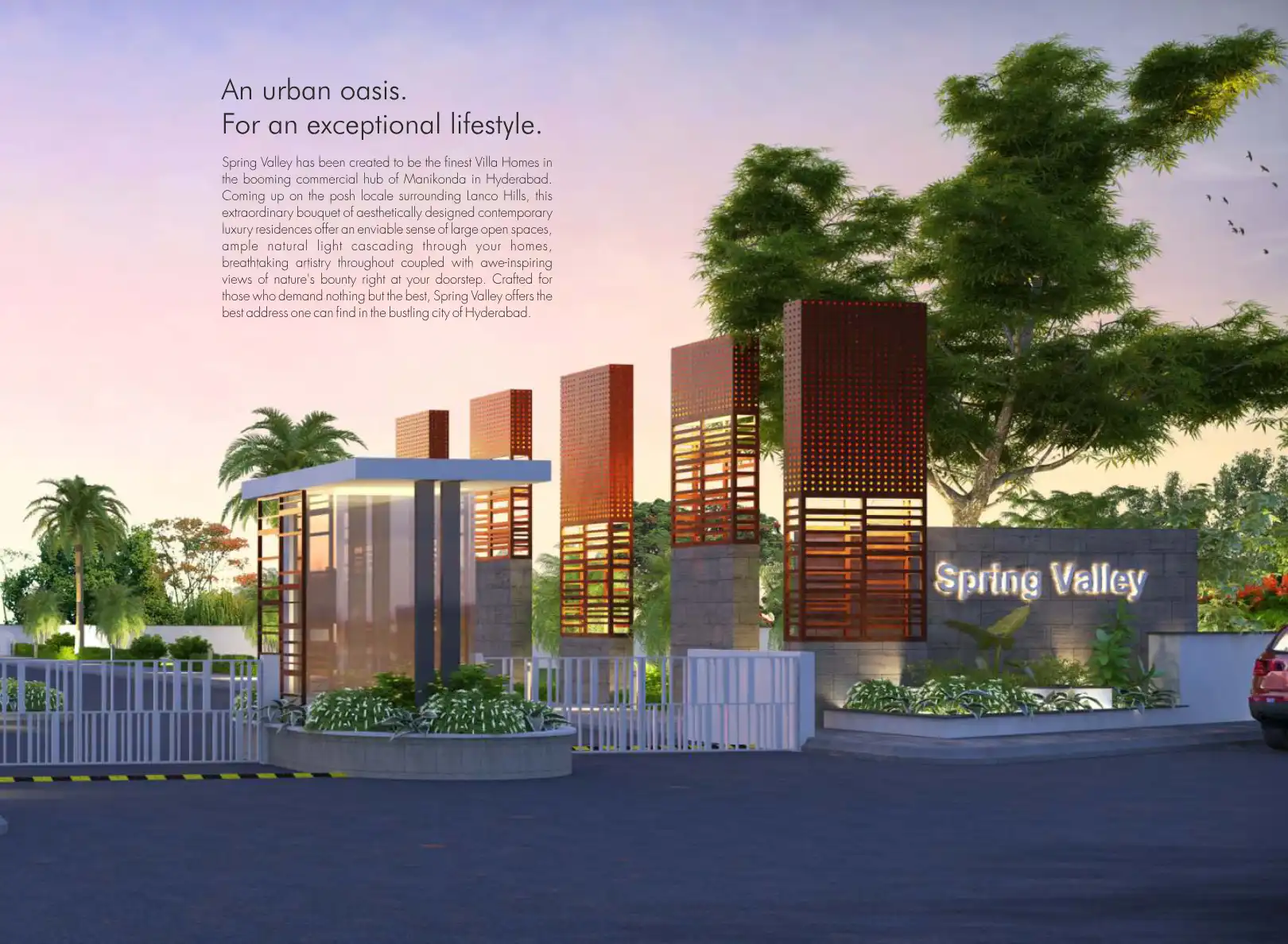 Spring Valley has been created to be the finest Villa Homes in the booming commercial hub of Manikonda in Hyderabad. Coming up on the posh locale surrounding Lanco Hills, this extraordinary bouquet of aesthetically designed contemporary luxury reside...