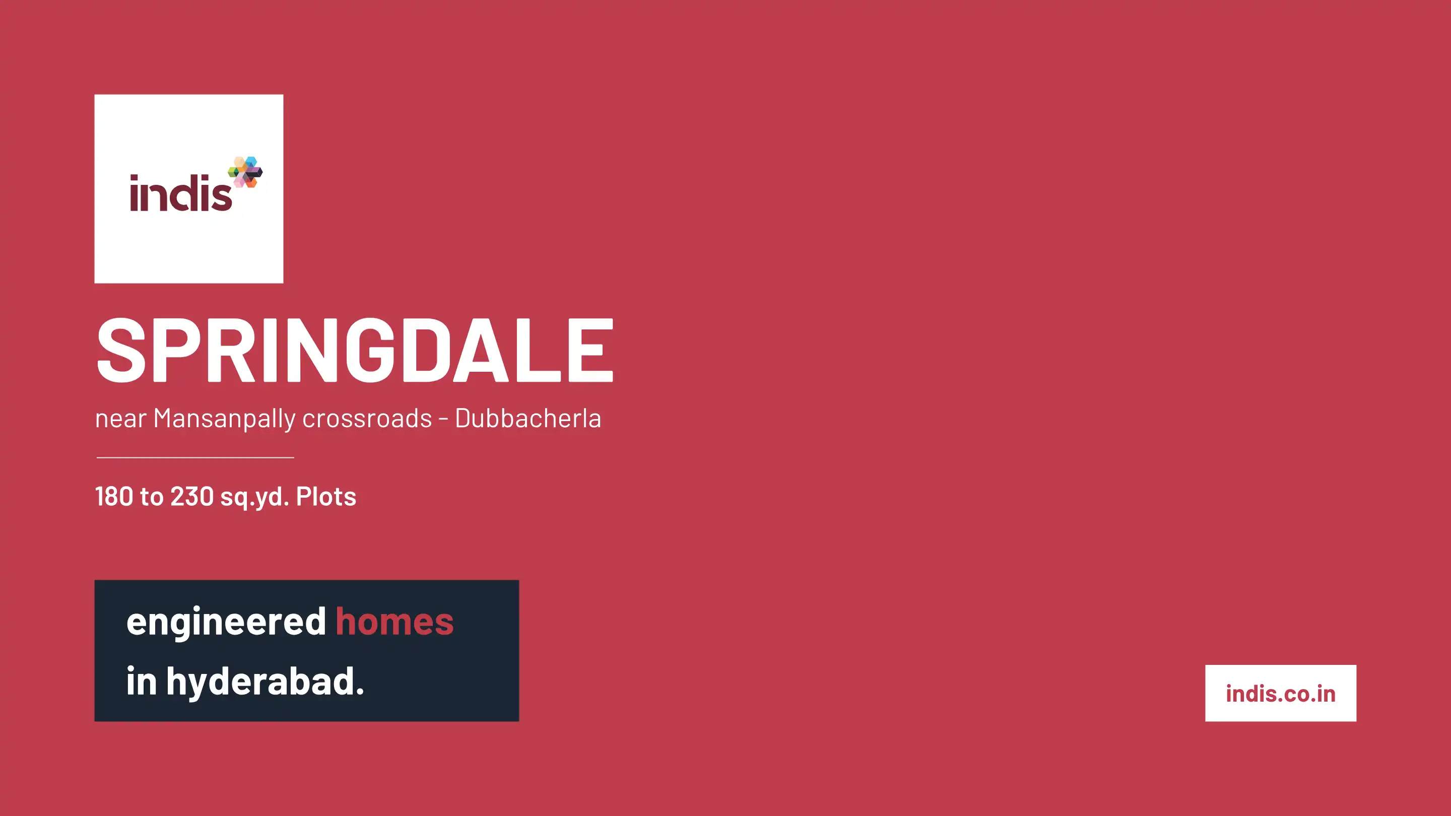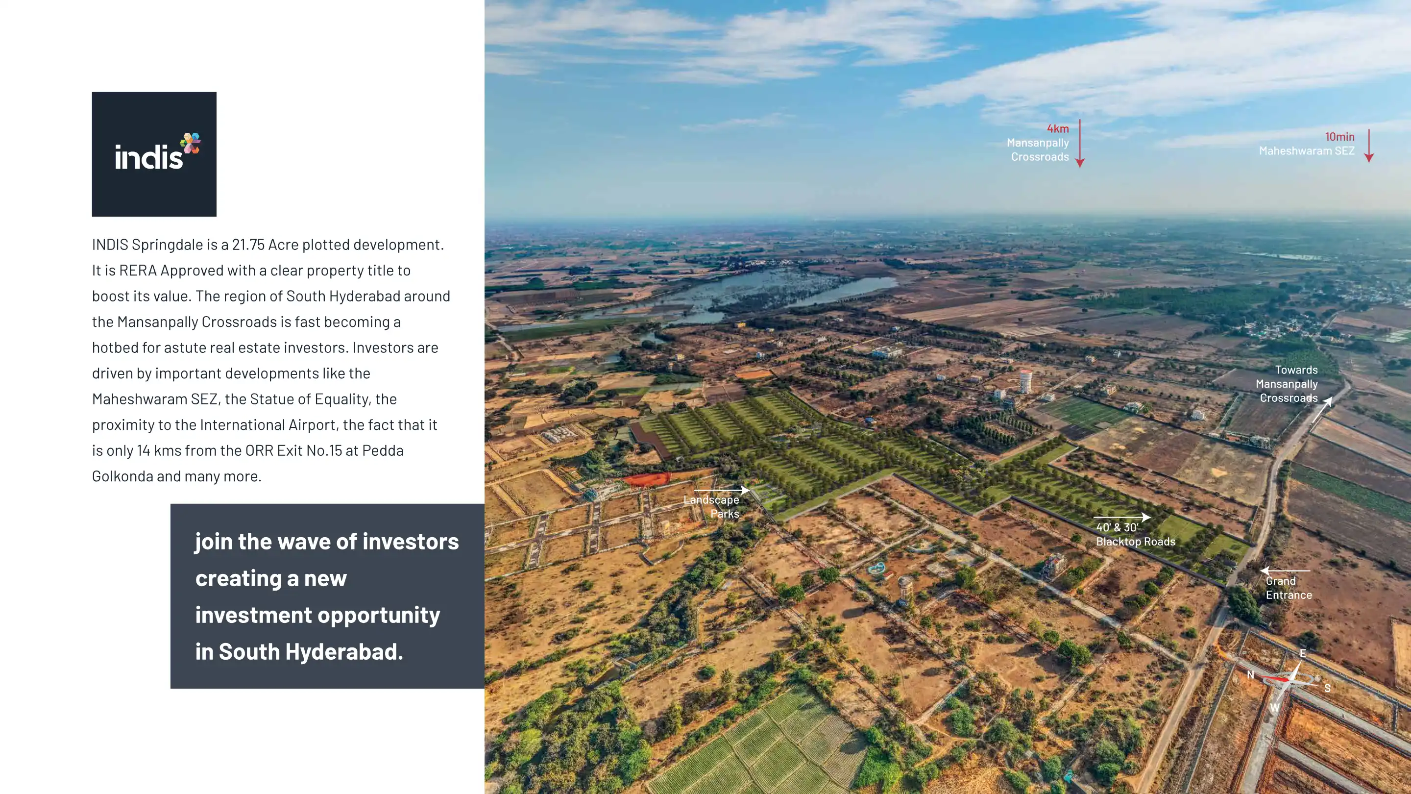INDIS Springdale is a 21.75 Acre plotted development. It is RERA Approved with a clear property title to boost its value. The region of South Hyderabad around the Mansanpally Crossroads is fast becoming a hotbed for astute real estate investors. Inve...