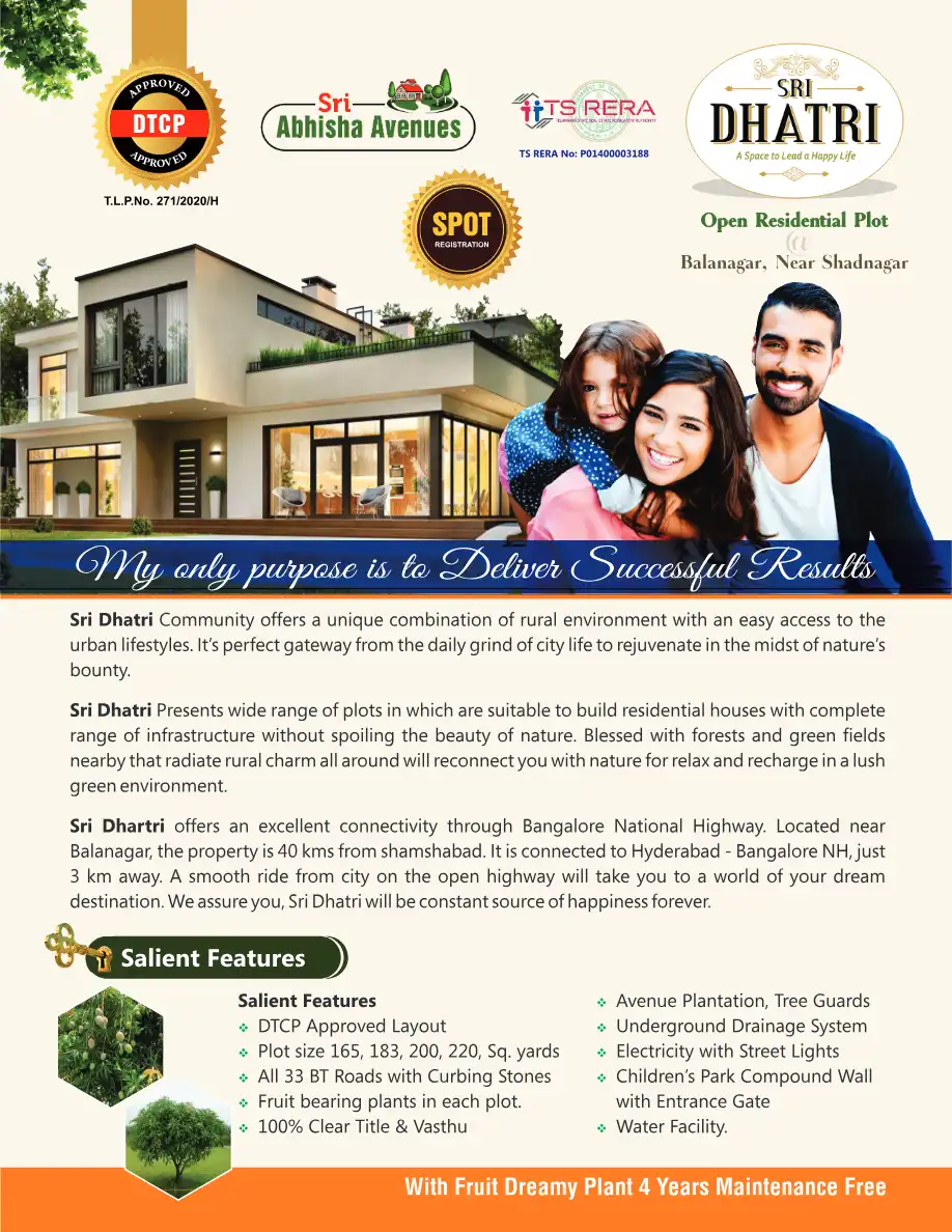 Sri Dhatri Community offers a unique combination of rural environment with an easy access to the urban lifestyles. It's perfect gateway from the daily grind of city life to rejuvenate in the midst of nature's bounty. Sri Dhatri Presents wide range of...