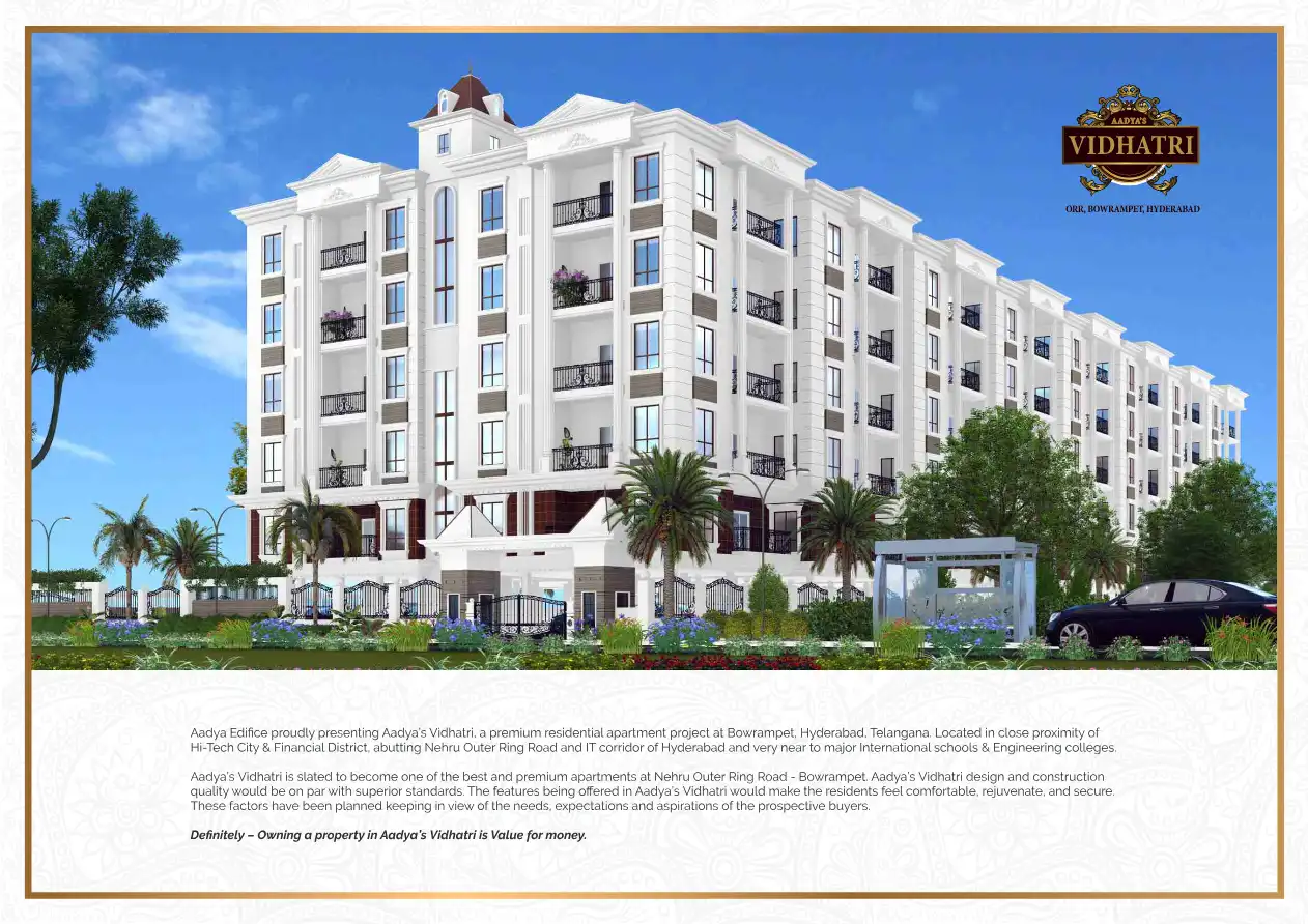 A premium residential apartment project at Bowrampet, Hyderabad, Telangana. Located in close proximity of Hi-Tech City & Financial District, abutting Nehru Outer Ring Road and IT corridor of Hyderabad and very near to major International schools & En...