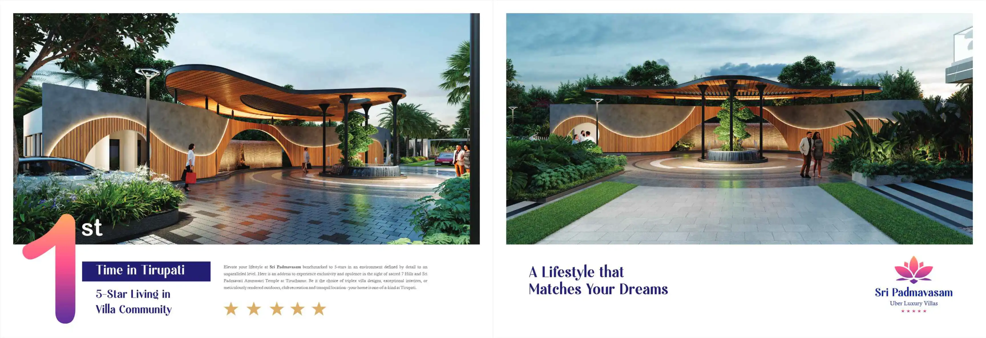 Sri Padmavasam is a luxury villa community located in Tirupati, offering 5-star living in a serene environment. The villas feature triplex designs, exceptional interiors, and meticulously rendered outdoors, with amenities for recreation and a tranqui...