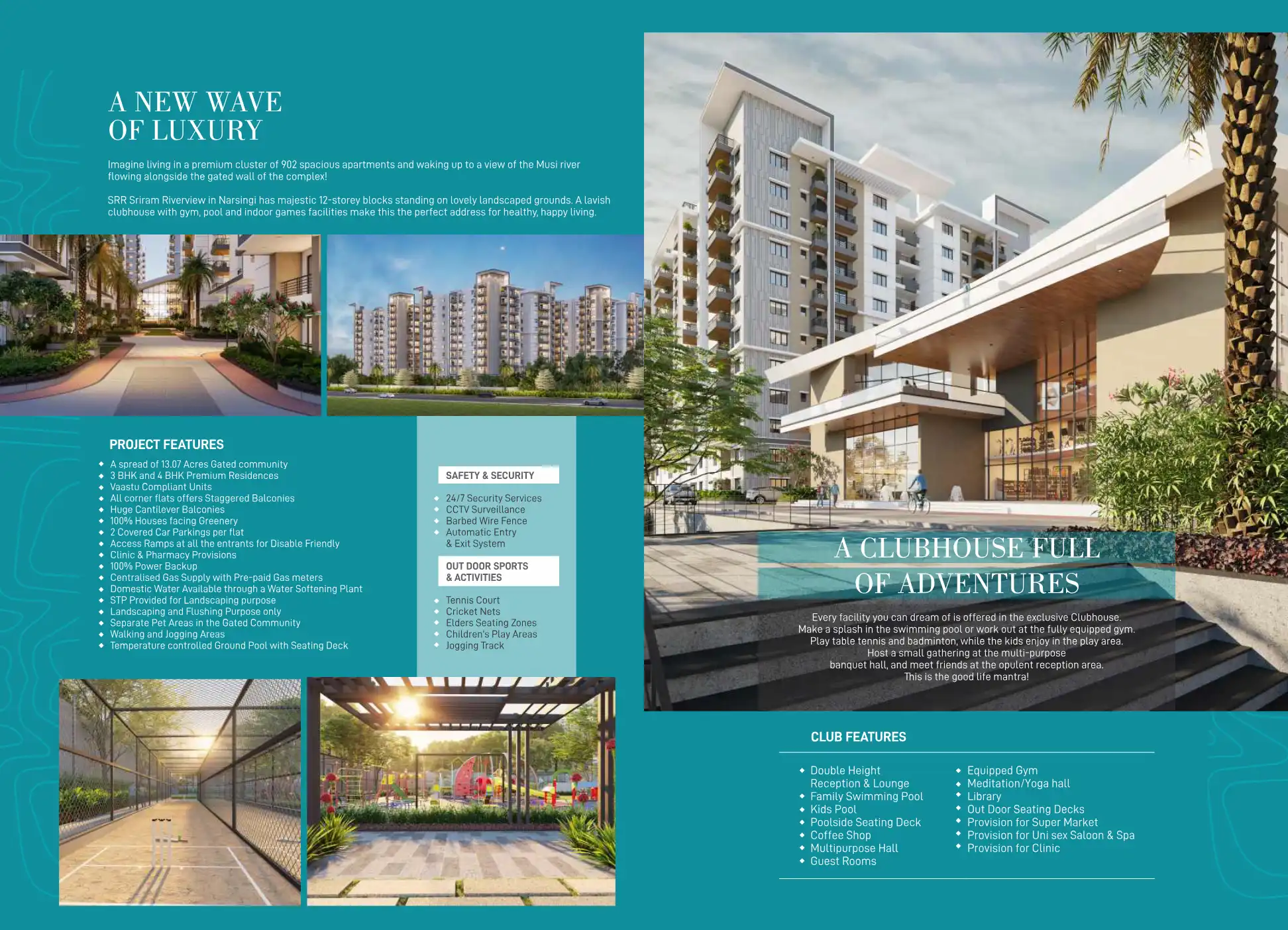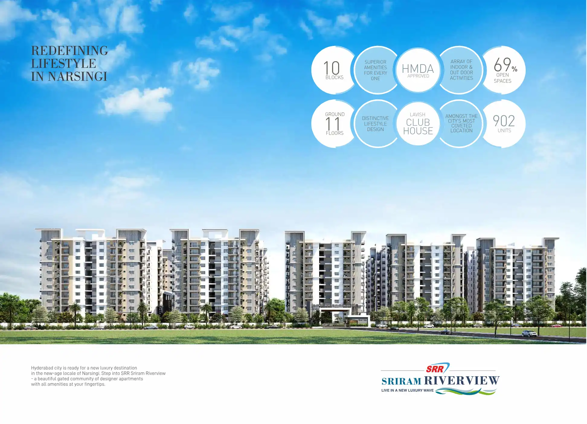 Imagine living in a premium cluster of 902 spacious apartments and waking up to a view of the Musi river flowing alongside the gated wall of the complex! SRR Sriram Riverview in Narsingi has majestic 12-storey blocks standing on lovely landscaped gr...