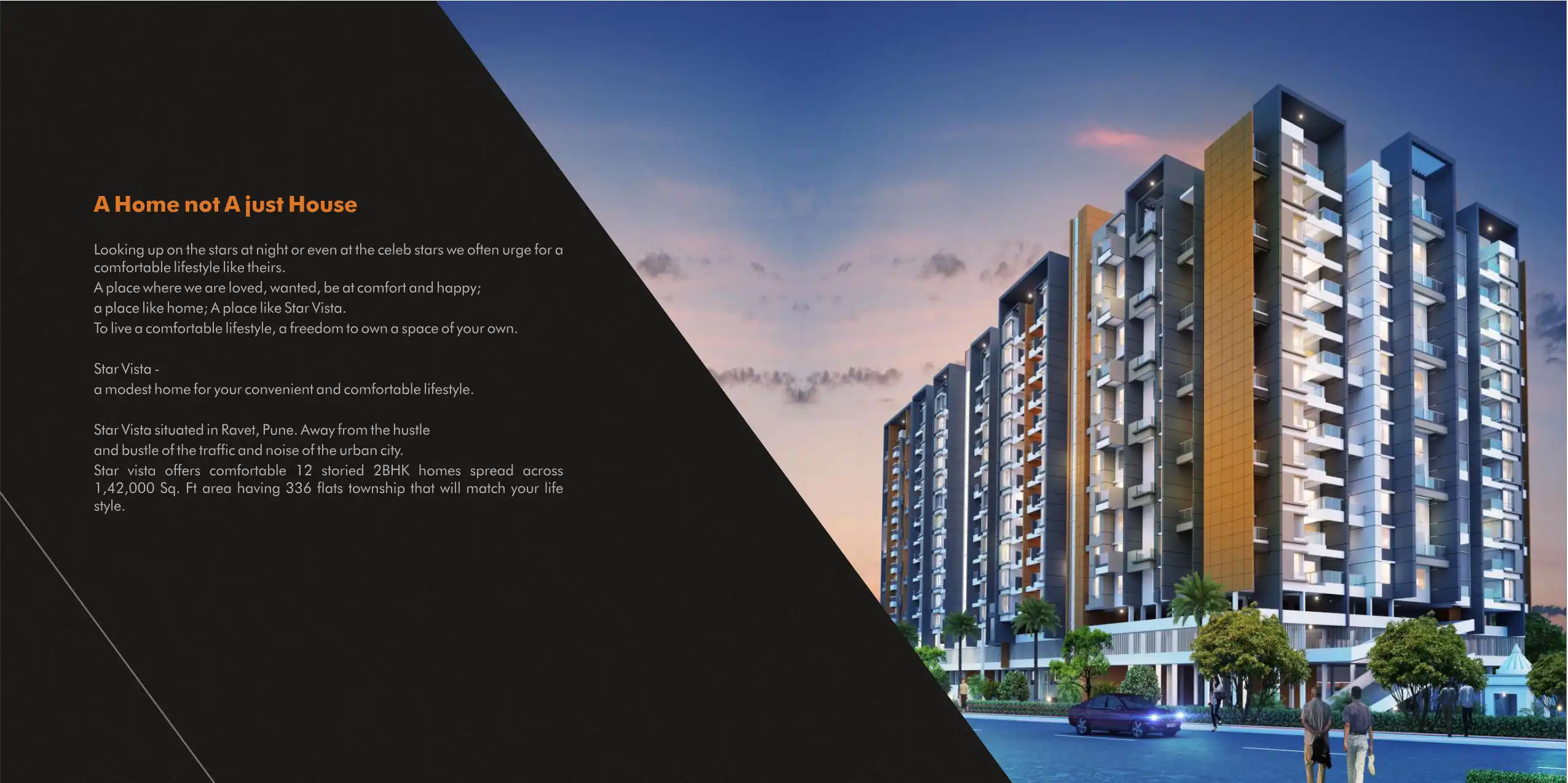 STAR VISTA offers comfortable 12 storied 2BHK homes spread across 1,42,000 Sq. Ft area having 336 flats township that will match your life style.