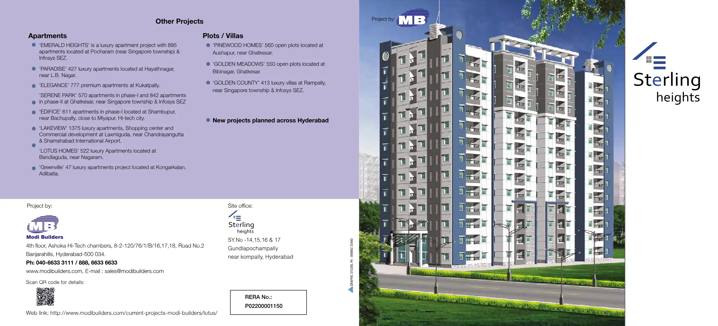 'Sterling heights' is a luxury gated community apartment project with state of the art amenities and recreational facilities spread over an area of about 6 acres. 22.8 Guntas. The project consists of luxury apartment with superior specifications. Sit...