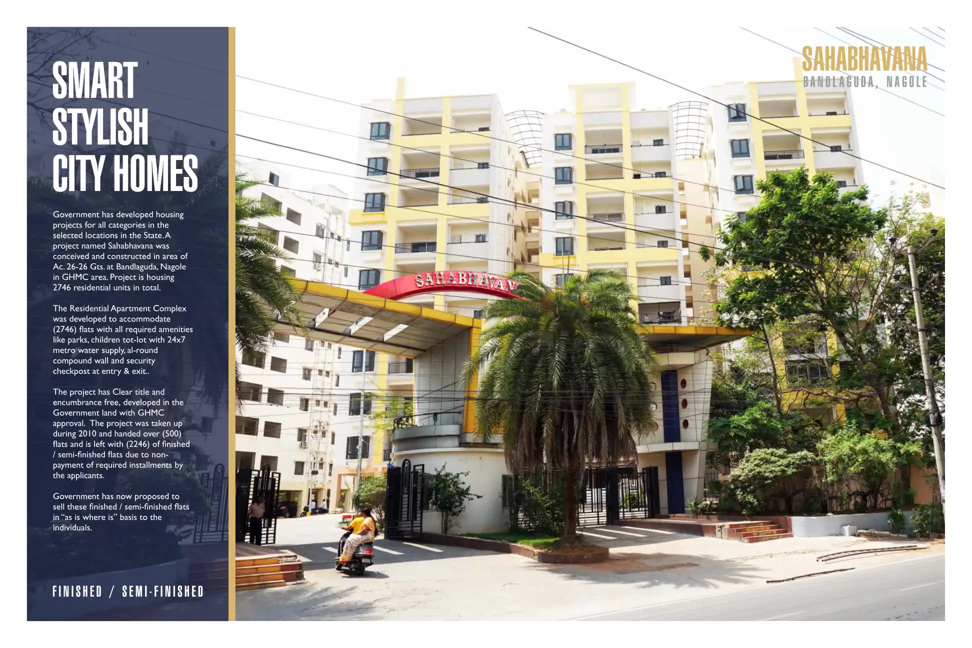 Government has developed housing projects for all categories in the selected locations in the State. A project named Sahabhavana was conceived and constructed in area of Ac. 26-26 Gts. at Bandlaguda, Nagole in GHMC area. Project is housing 2746 resid...