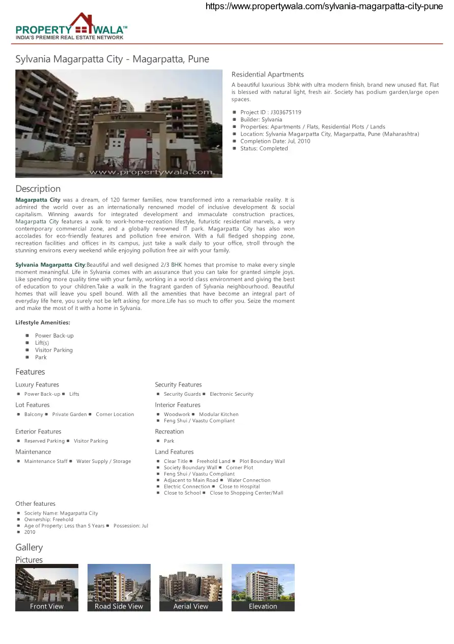 Magarpatta City is a renowned integrated township located in Hadapsar, Pune. It's a self-sustained urban development that seamlessly blends residential, commercial, and IT spaces with educational institutions, healthcare facilities, shopping malls, and extensive green areas, offering a modern and convenient lifestyle.