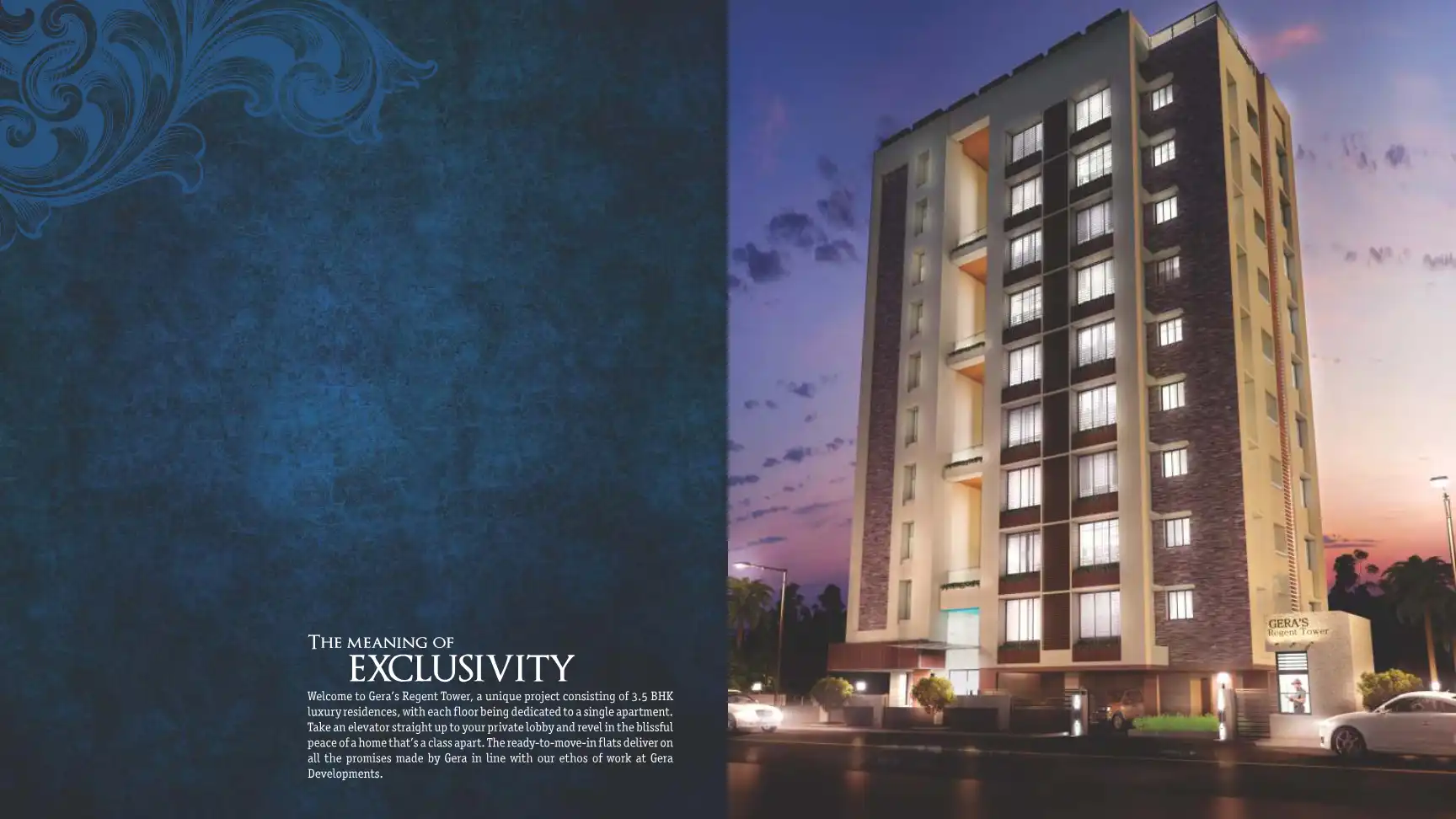 Gera's Regent Tower, a unique project consisting of 3.5 BHK luxury residences, with each floor being dedicated to a single apartment.